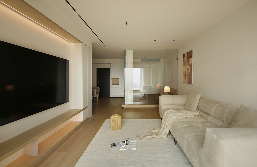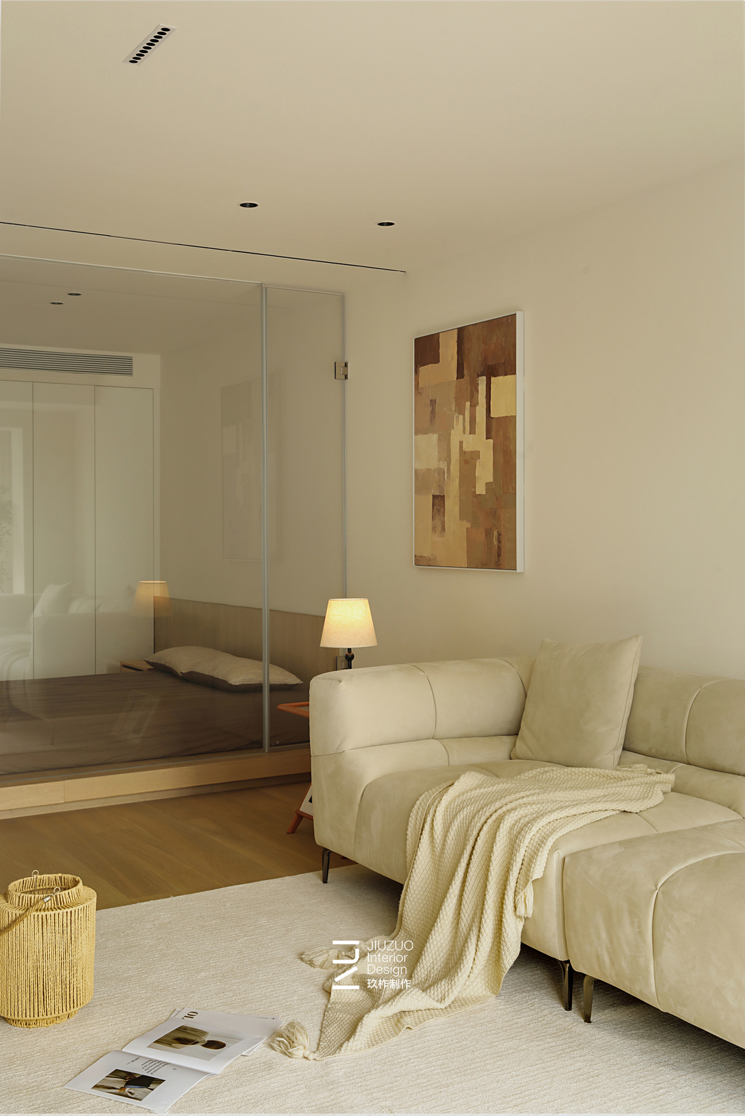 次卧看向客厅的视角;玻璃材质让视觉无遮挡,把睡眠区与公区关联,打破空间壁垒让生活更自由随性;