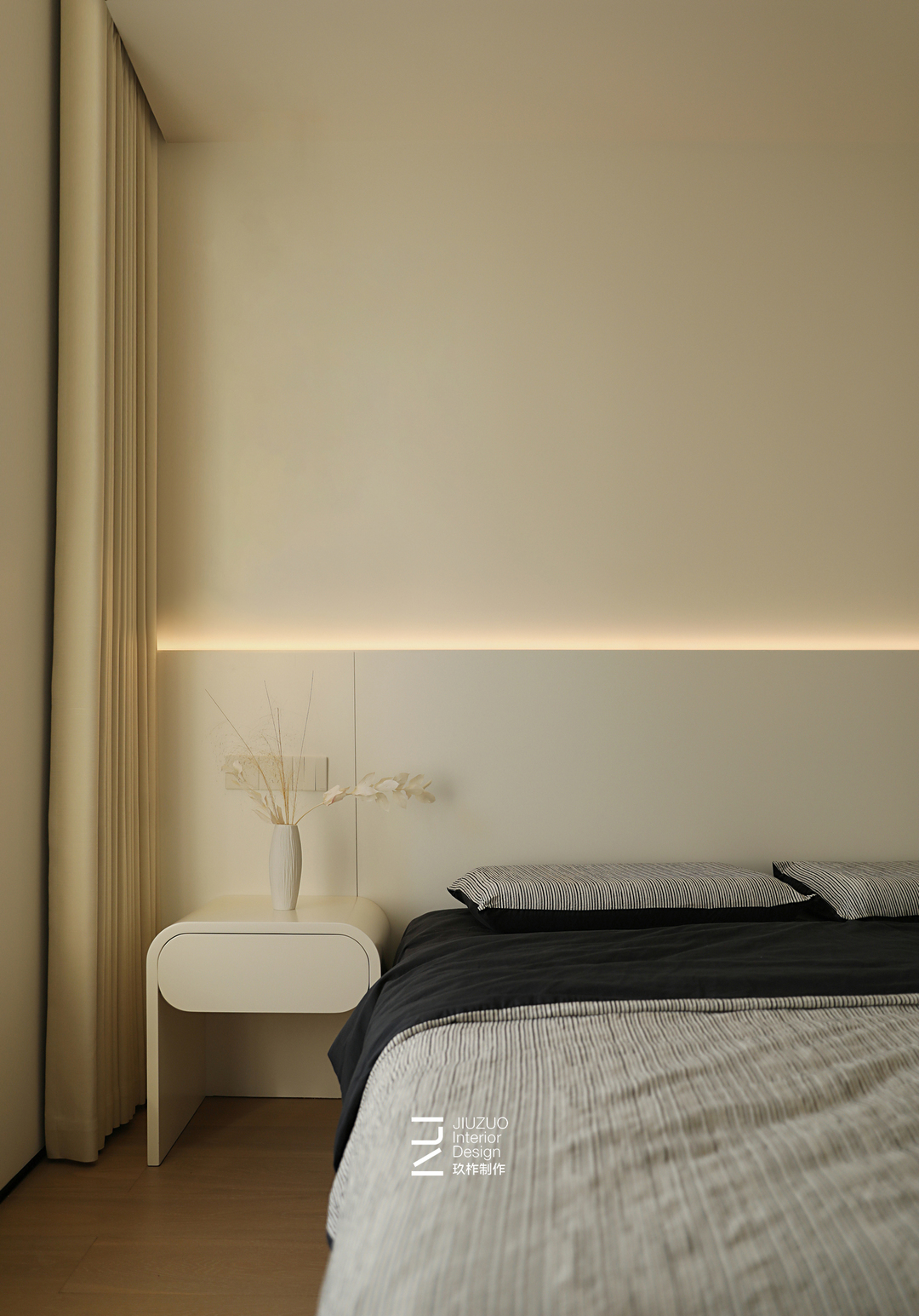 背景墙采用半高的木饰面设计,来满足床靠背的同时更加节省空间,并在背后提前内嵌灯带设计与顶面反光灯带相呼应,提升卧室氛围感;