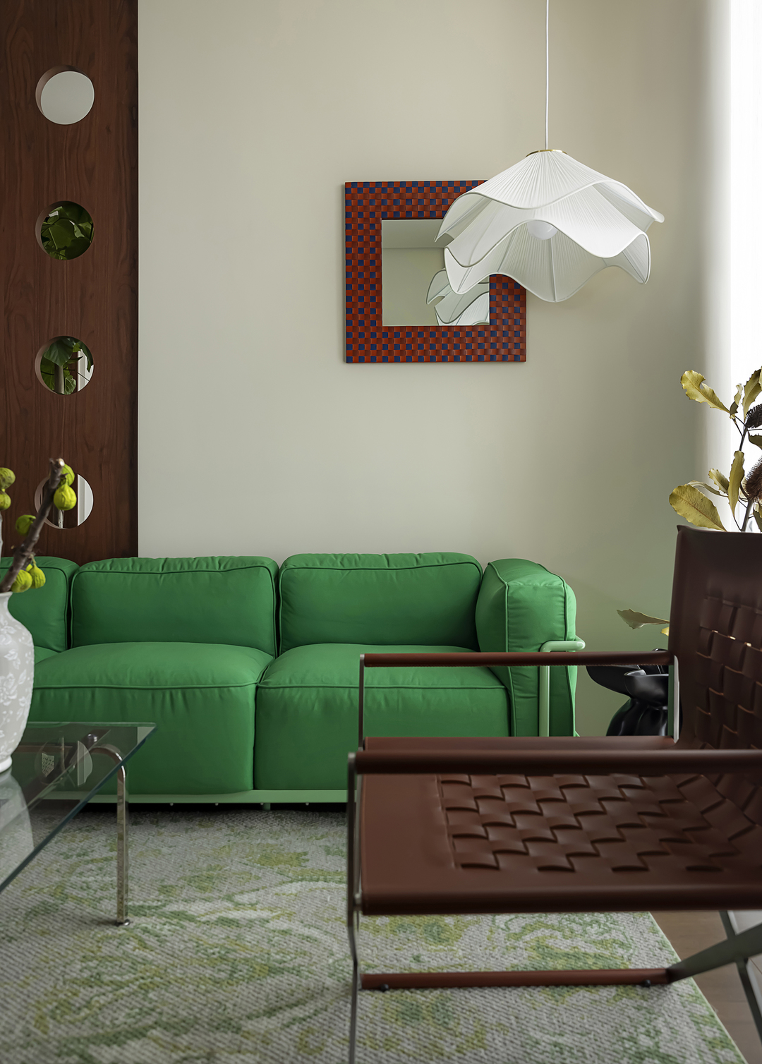 草绿沙发跳脱吸睛,搭配木质隔断,皮质座椅,以荷叶灯添柔,碰撞清新现代感。