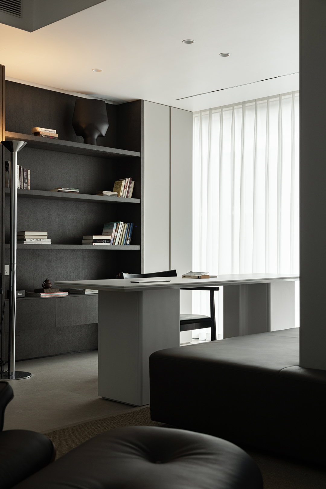 通高柜体覆以哑光烤漆板形成空间立面构成,大块面瓷砖地板通铺打造一体感,灰阶基底上搭配深色木饰面、天然石材和开放格点缀,通过视觉连续性强化空间整体感。