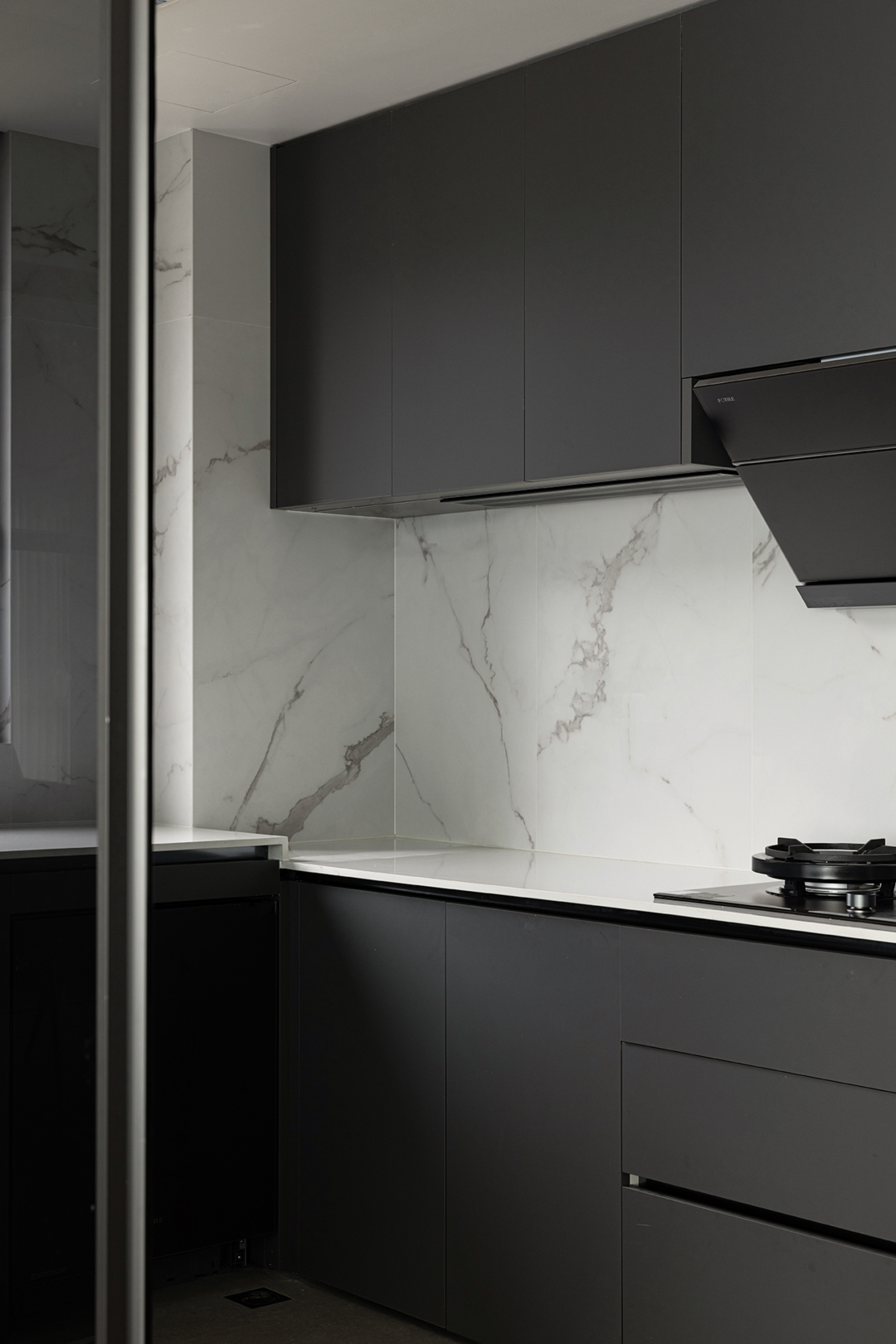 悬浮吊柜与暗藏式线性照明的组合,在提升操作便利的同时,以光影层次消解体量厚重感,再结合整体空间内的材质色系把控,使功能构建自然融入空间基底,完成结构限制到功能美学的现代性转译。