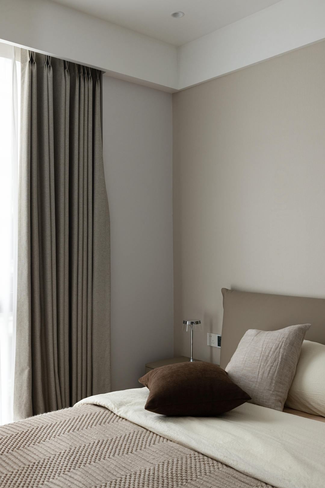 主卧设计以实用性与舒适性为出发点,围绕实用功能与居住习惯展开规划:收纳系统通过定制组合衣柜实现换季区与日常高频区的分区管理;灯光采用筒灯提供基础照明,配合床头阅读灯来平衡功能与氛围的需求;地面通铺木地板提升触感舒适度,用材质细节来强化卧室特征。