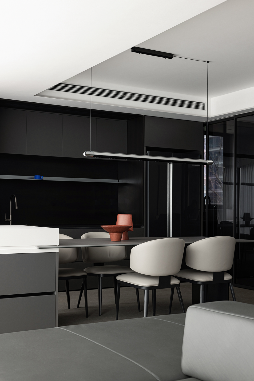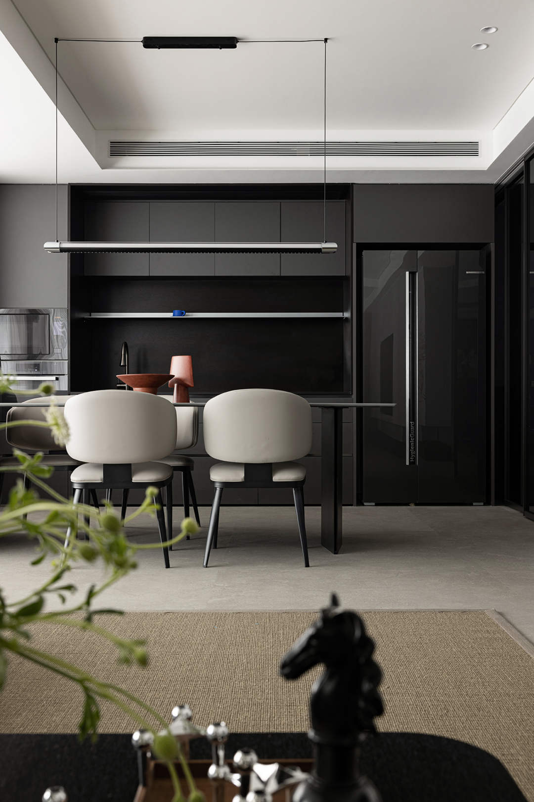 中厨空间以顶置吊轨的方式实现空间界面的隐形转换,吊轨系统通过预埋结构与天花板造型整合,地面无门槛石过渡,完整保留空间的纯粹状态。