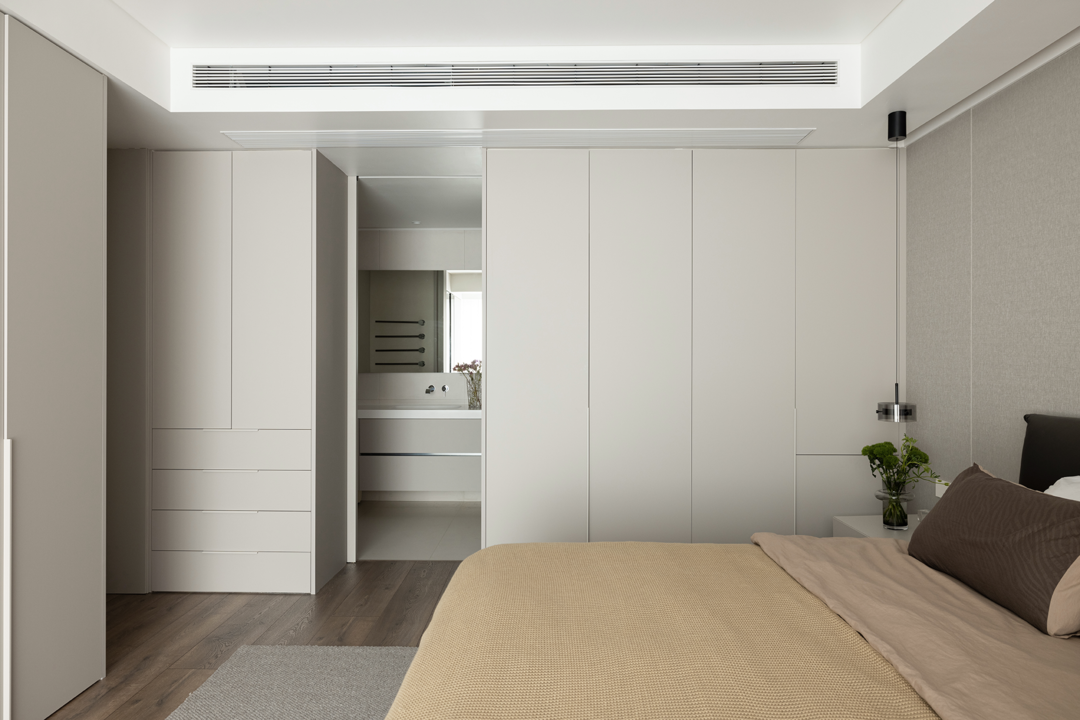 空间延续公区整体风格,卧室入口门与两侧柜体采用同色同高设计,门板材质与柜体饰面完全统一,上下取消收口线条,形成简洁连贯的立面效果。