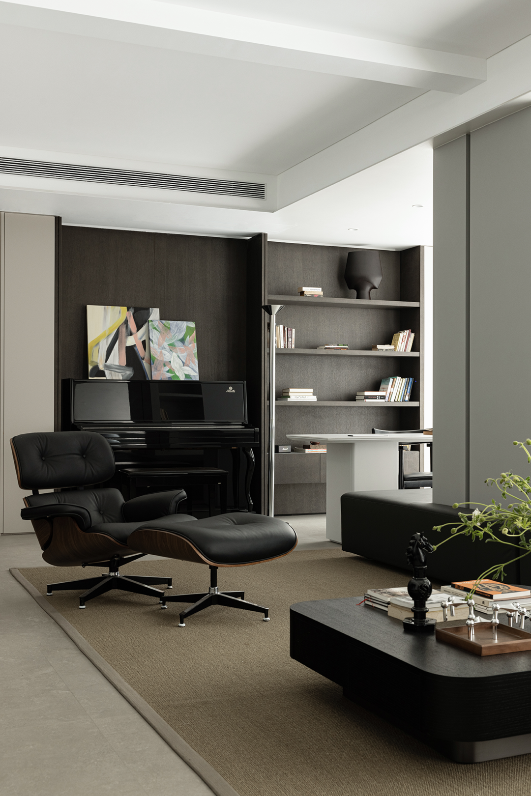 钢琴区和阅读区采用渗透式布局,与客厅形成功能上的叠加,依墙体设置开放式书架和储物抽屉,钢琴区采用嵌入柜体式设计,充分利用空间的边角区域,从材质上确保功能构建在视觉层面隐形于空间基调中。