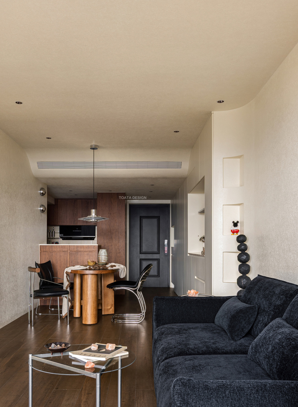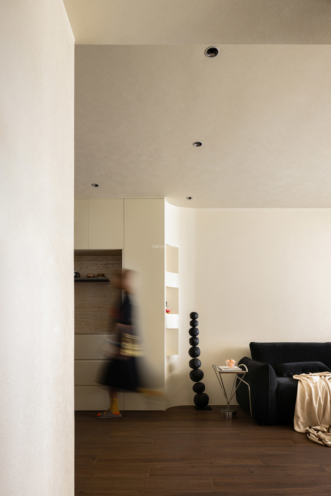 设计师融入了弧形天花的元素,柔和的曲线顺着空间轮廓自然延伸。一方面,它打破了方正空间的单调感,空间多了几分灵动与层次;另一方面,利用曲线的导向性和包裹感,弱化了棱角带来的生硬感,让屋主能感受到松弛、舒适的氛围,无论是家人围坐聊天,还是独自休憩,都格外放松