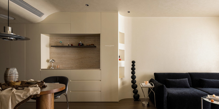 立于过道处回望,餐边柜的体块与弧形背景墙相辅相成,共同勾勒出一个和谐而富有层次感的画面,格局与美感尽收眼底