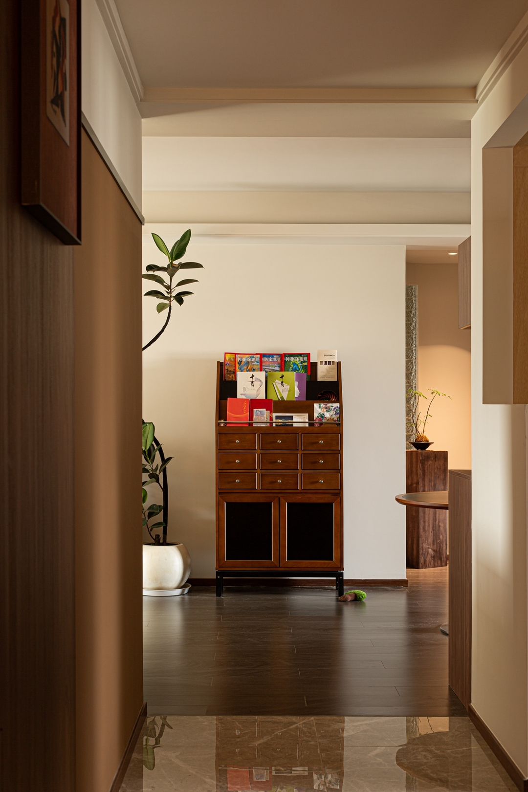 玄关以米白+中古色为基调,大量运用胡桃木与藤编中古风经典材质营造温馨氛围,定制柜用骨格线做装饰,门后定制隐形挂衣区,方便包包衣物的悬挂,功能至上,在有限空间内高效解决换鞋、收纳、整理仪容、短暂停留的需求,打造一个一个温暖、简洁、富有质感且功能完备的空间