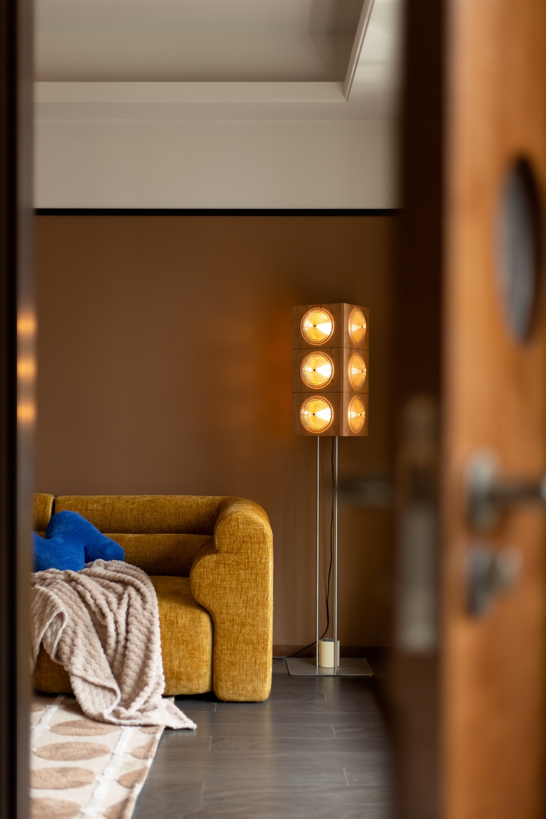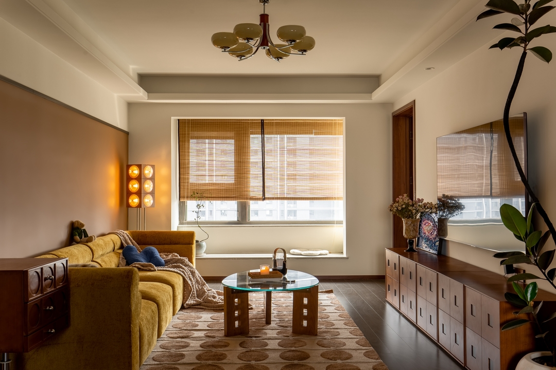 整个客厅呈现 中古复古风基调氛围,完美融合功能主义、简约线条、自然材质、有机形态以及温暖复古的色调,既是舒适的休憩空间,也是体现品味的艺术角落。