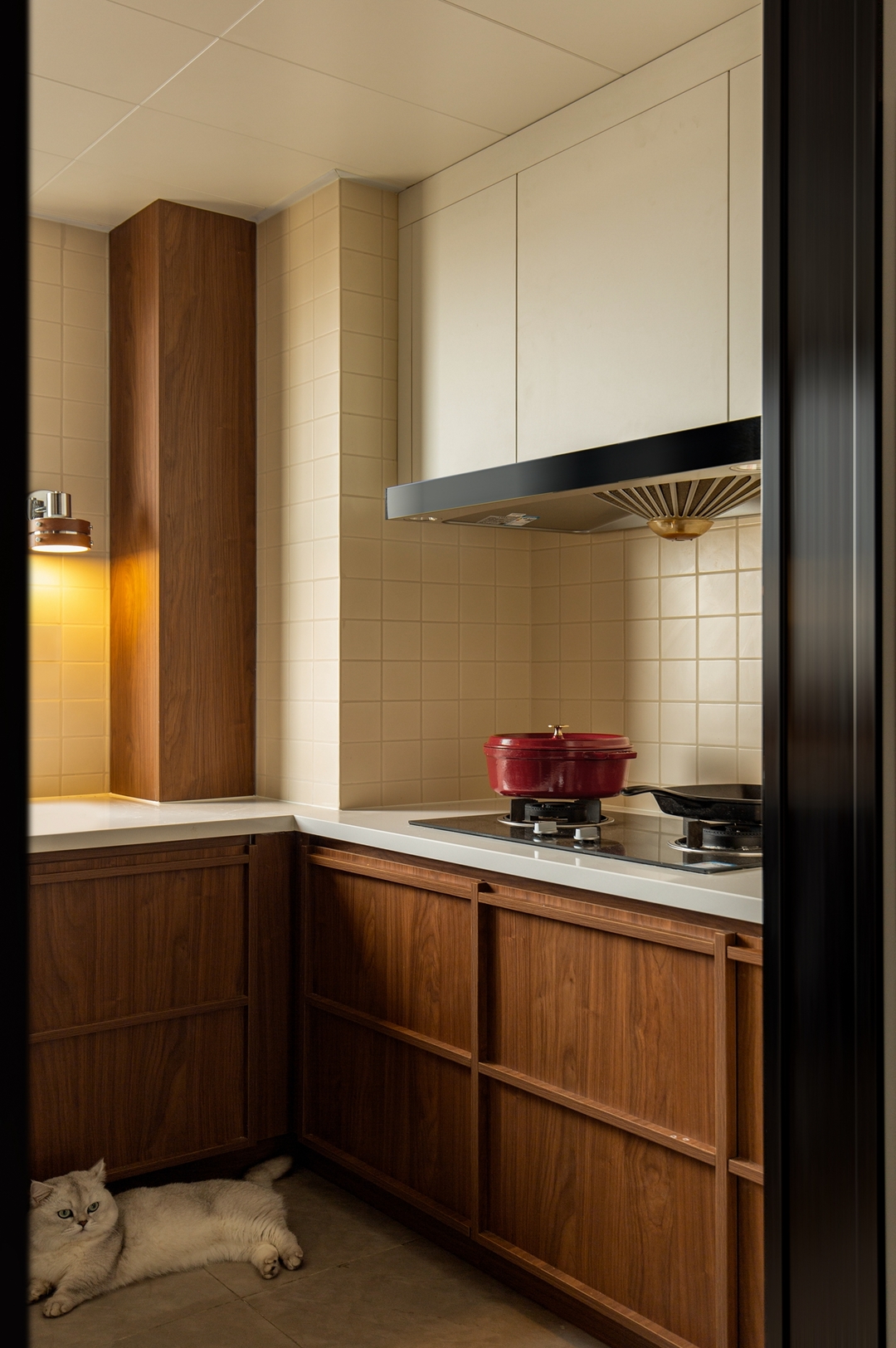 奶油色小方砖铺陈的墙面,如同温润的奶油基底,柔和地衬托着橱柜的深邃。临窗两侧,复古壁灯静静伫立,暖光为备餐时刻增添一抹温馨情调。