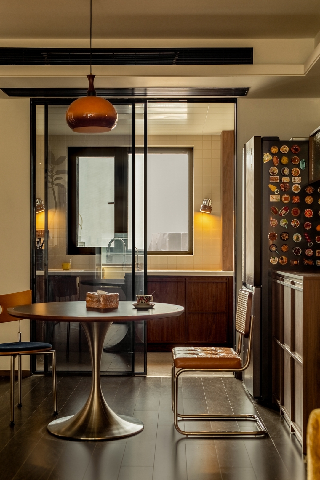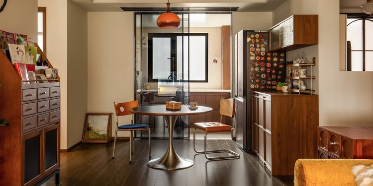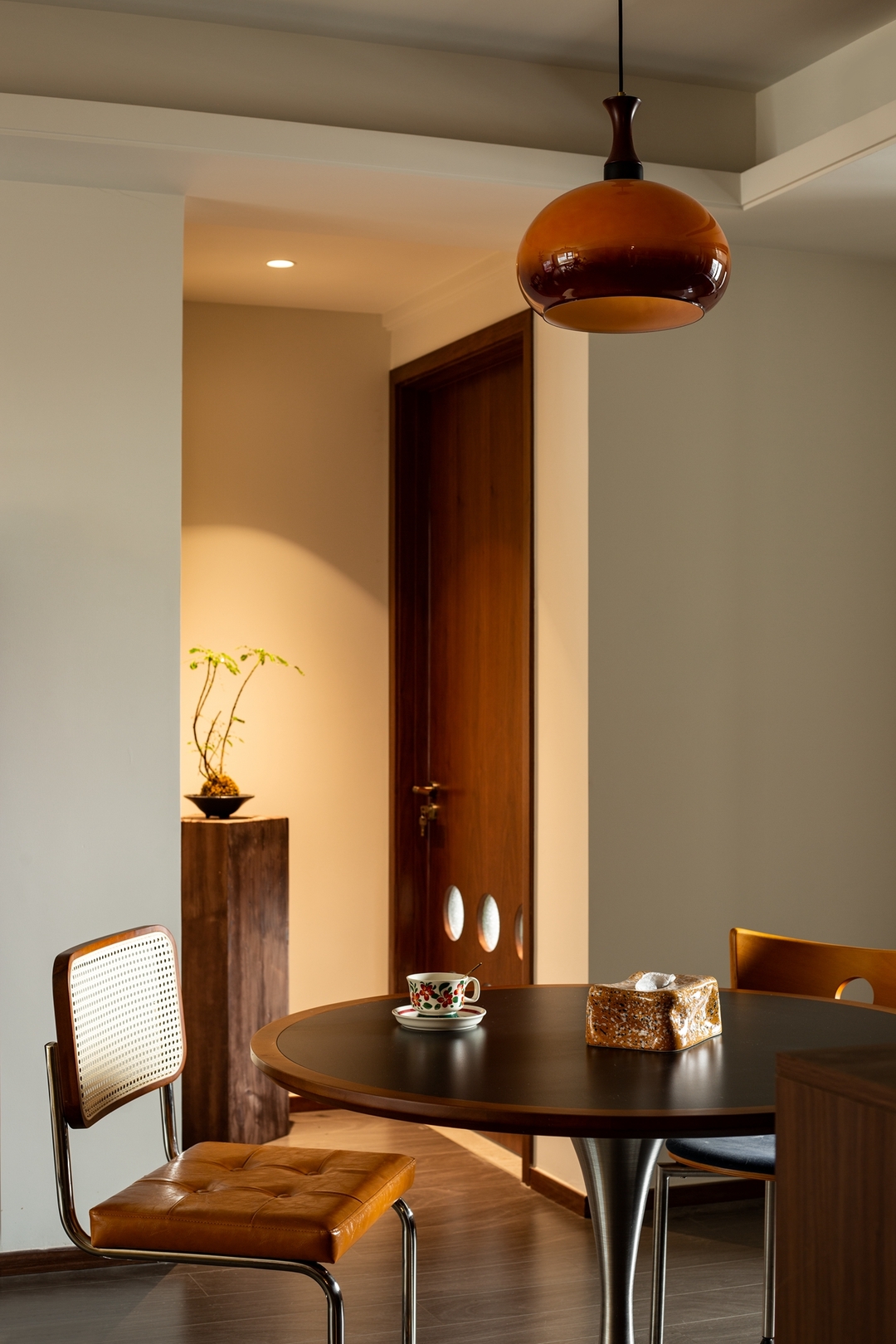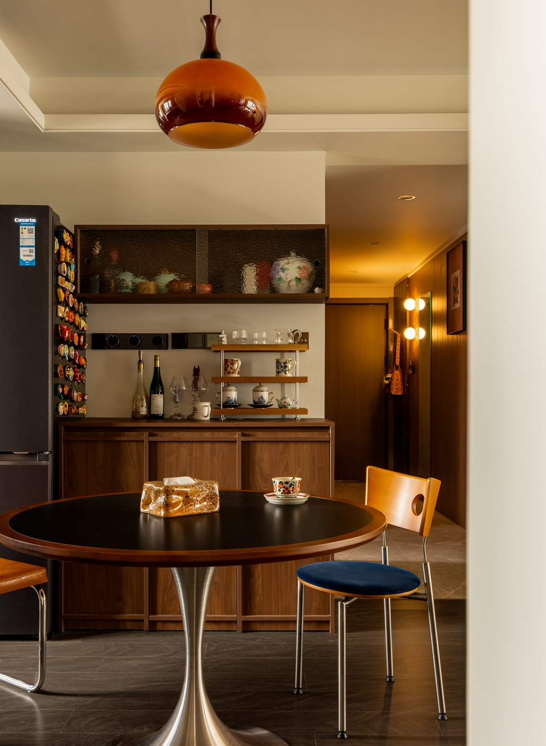 视线越过推拉门,餐厅区域豁然开朗。一侧墙面巧妙设计了中古色定制柜体,流畅整合了冰箱、便捷水吧与功能强大的餐边柜,延续了厨房的材质语言与优雅格调。空间的核心,则是一张线条简洁流畅的中古包豪斯风格圆形餐桌。其温润的木质或金属框架,呼应着整体的复古基调,圆润的造型不仅促进围坐交流的亲密感,更成为衔接两个区域的艺术焦点。整个空间在奶油色的温柔、中古色的深邃与包豪斯几何的理性中,交织出既实用又充满时光肌理的独特氛围。