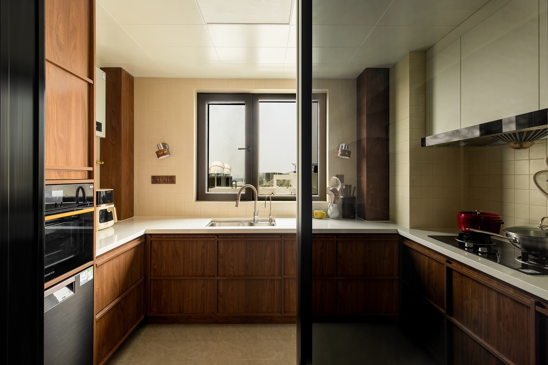 推开轻盈的玻璃推拉门,厨房与餐厅的界限变得柔和而通透。U型布局的厨房内,中古色调的定制橱柜沉稳而富有质感,柜门表面精心勾勒的骨骼线装饰,如同时光镌刻的脉络,赋予空间精致的复古灵魂。