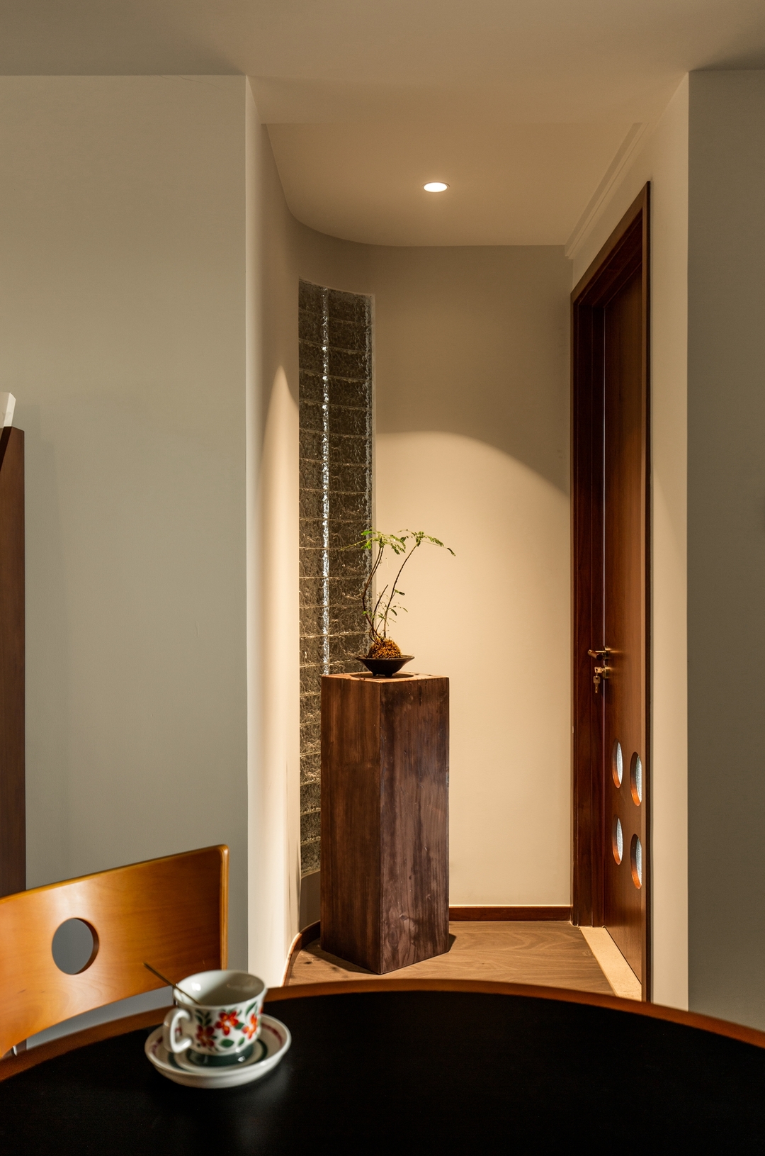 为保证过道的宽敞性,设计师用玻璃砖+弧形造型来改造,这样美观性,通透性以及空间的宽敞性都统统满足;