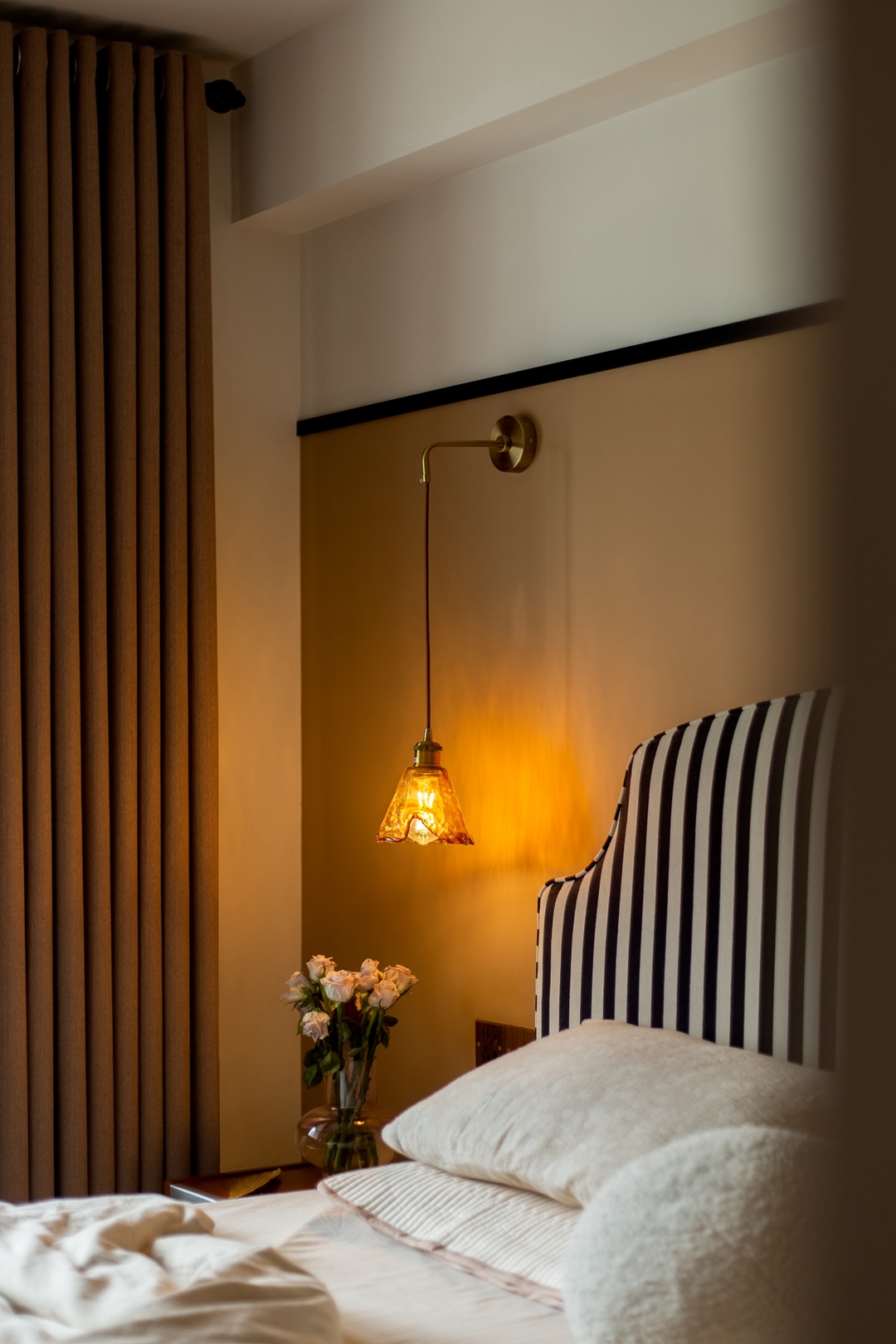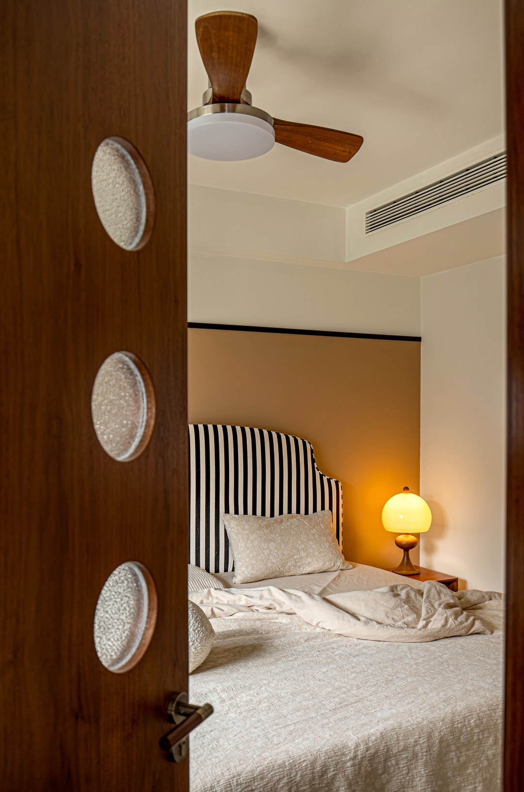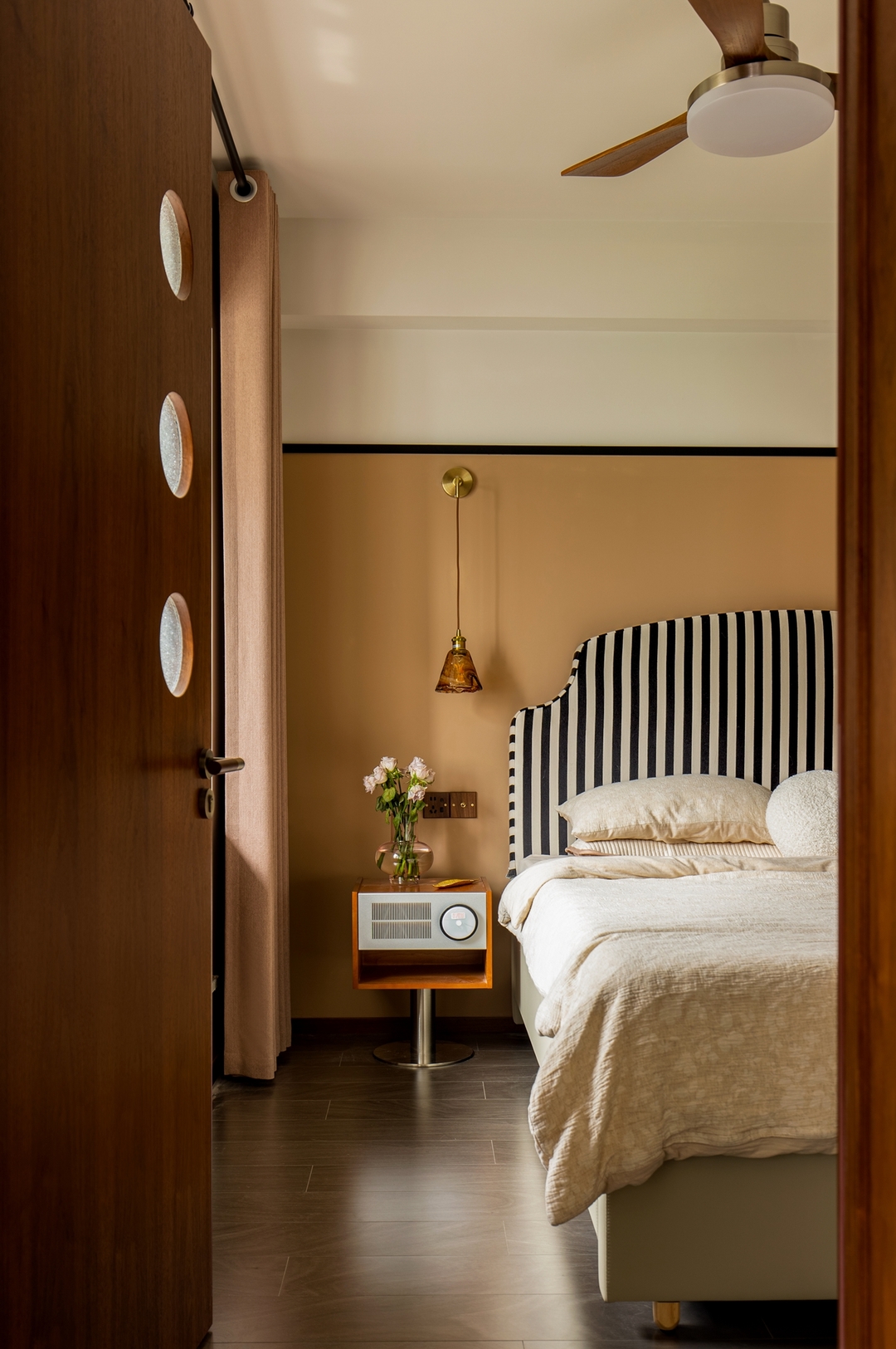 主卧一盏自带高级感的中古风扇灯,别致造型的中古风洞洞门,焦糖色床头背景墙,搭配极窄黑色线条,复古斑纹床唤醒摩登的魅力,经典又高级的条纹,游走于复古与现代之间,闪耀却不浮夸,华美又不失张力,诉说着摩登优雅的万种风情,床头户型线条起伏有致,满满的氛围感;