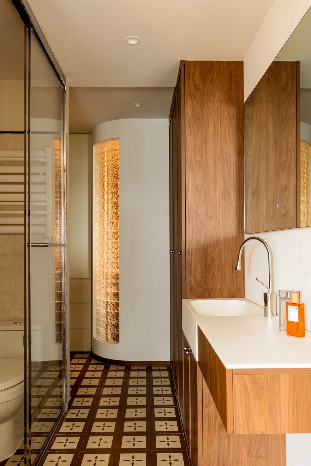 地面复古花砖营造复古氛围,弧形玻璃砖造型墙,开灯及一道靓丽的风景线