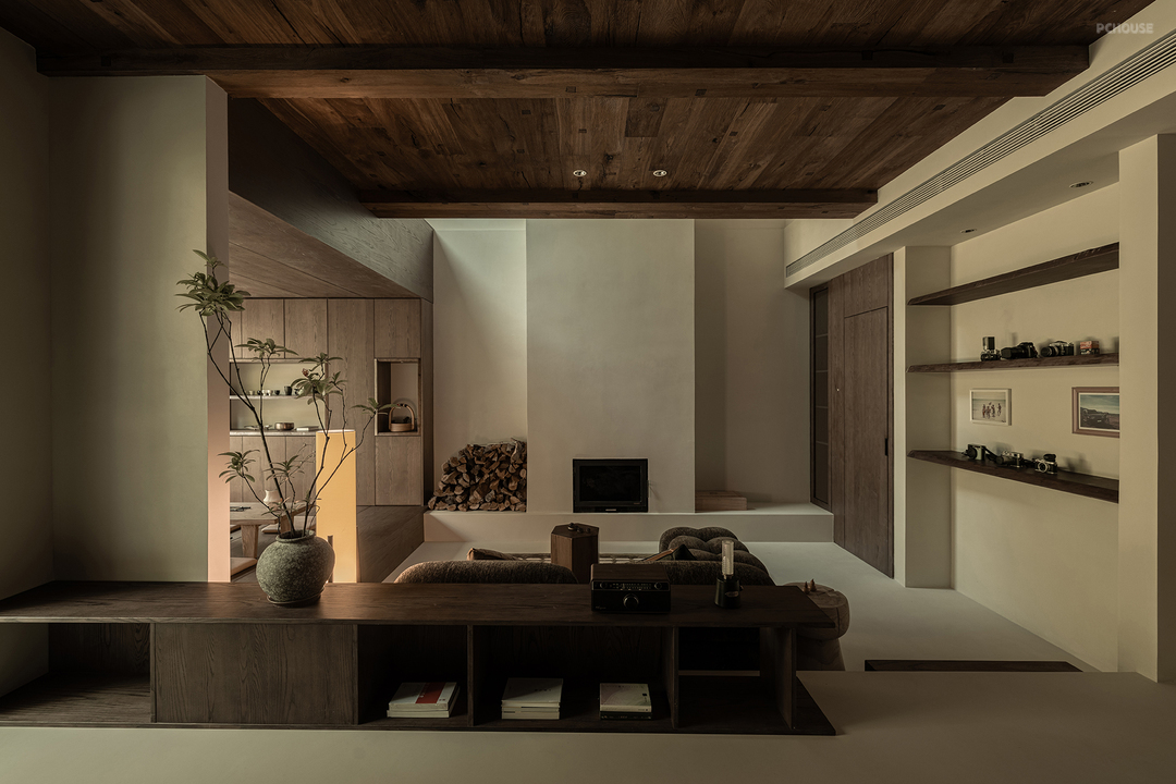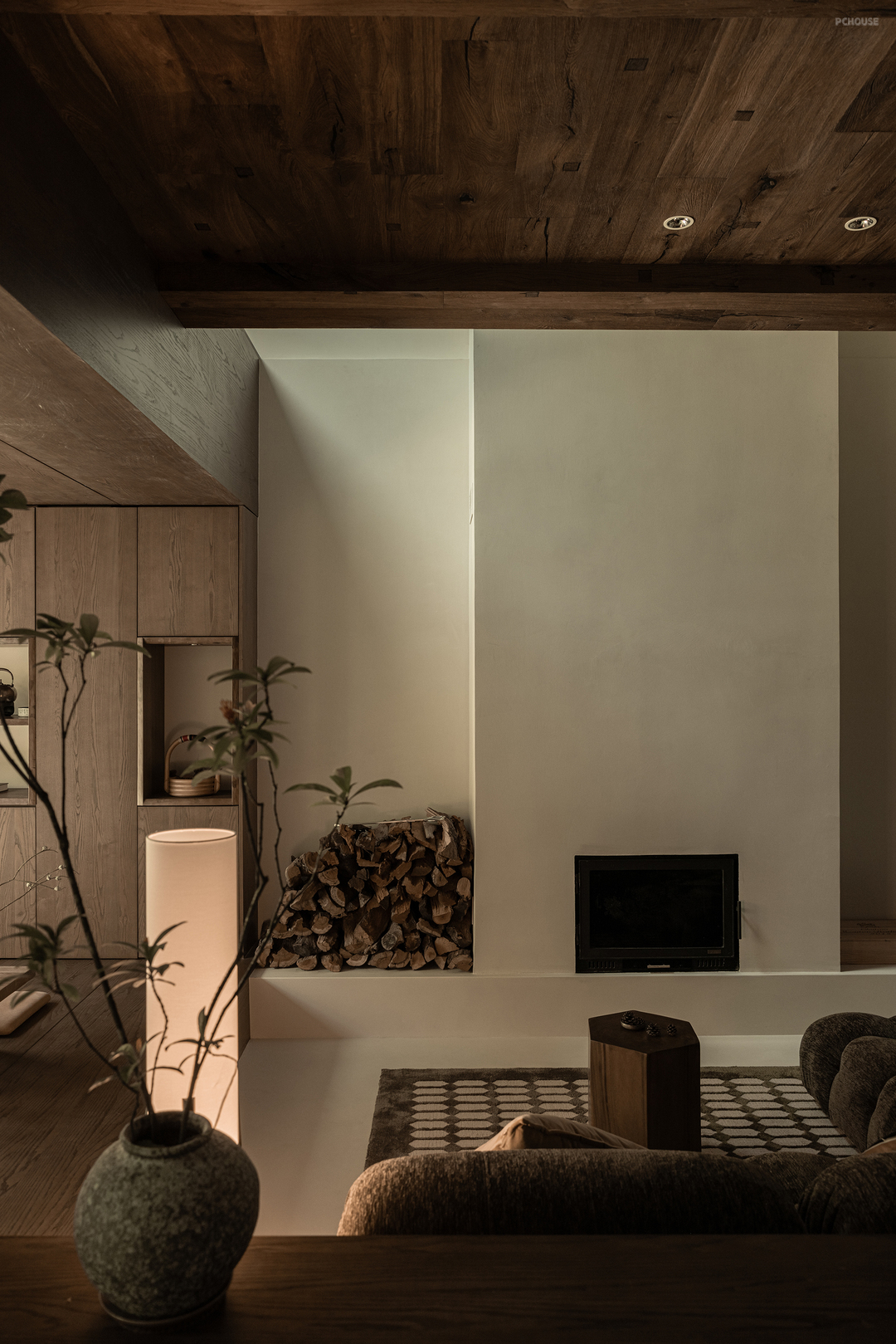 休闲区采用下沉式设计,松软的沙发围合在壁炉旁,既保留了空间的开放性,又构建出一个有包裹感且具亲密感的温暖角落,让空间层次更加丰富。