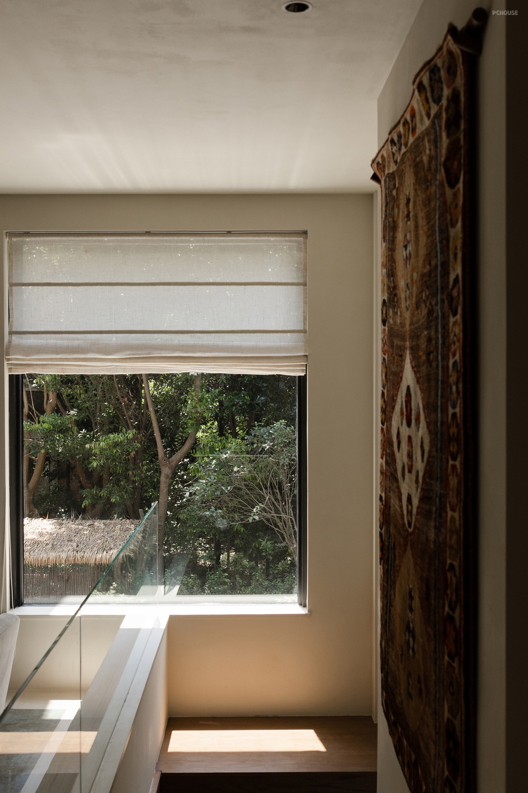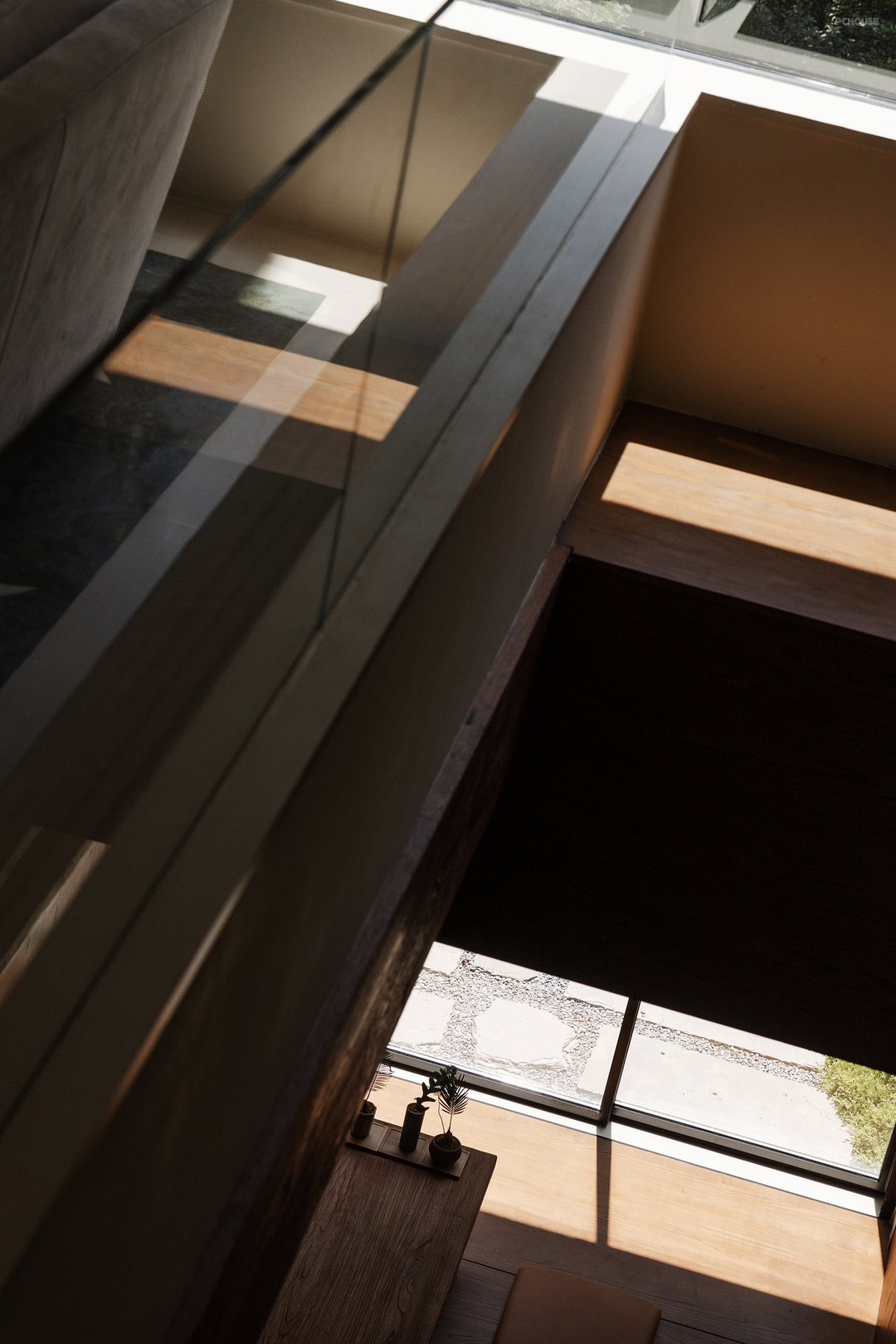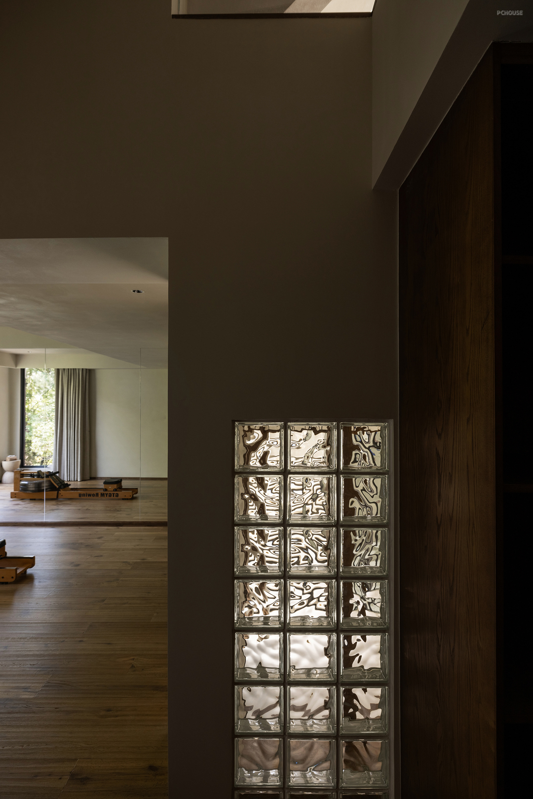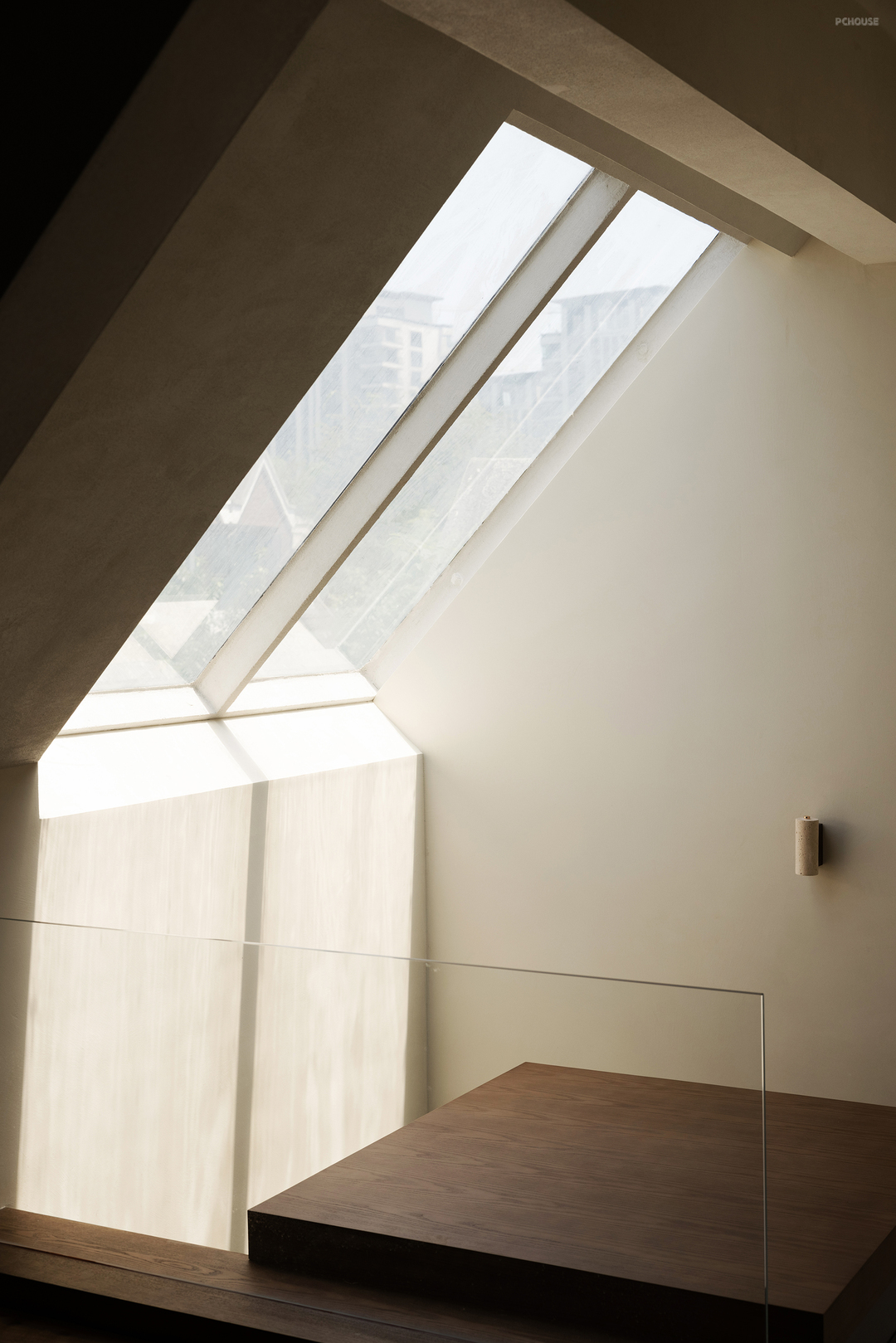打通壁炉上面的部分天井,让负一层与客厅形成联动,将自然光线引入地下。随着时间的推移,光线从上而下自然倾斜,在干净的墙面上呈现出一幅幅自然的画作,空间也随之呼吸。