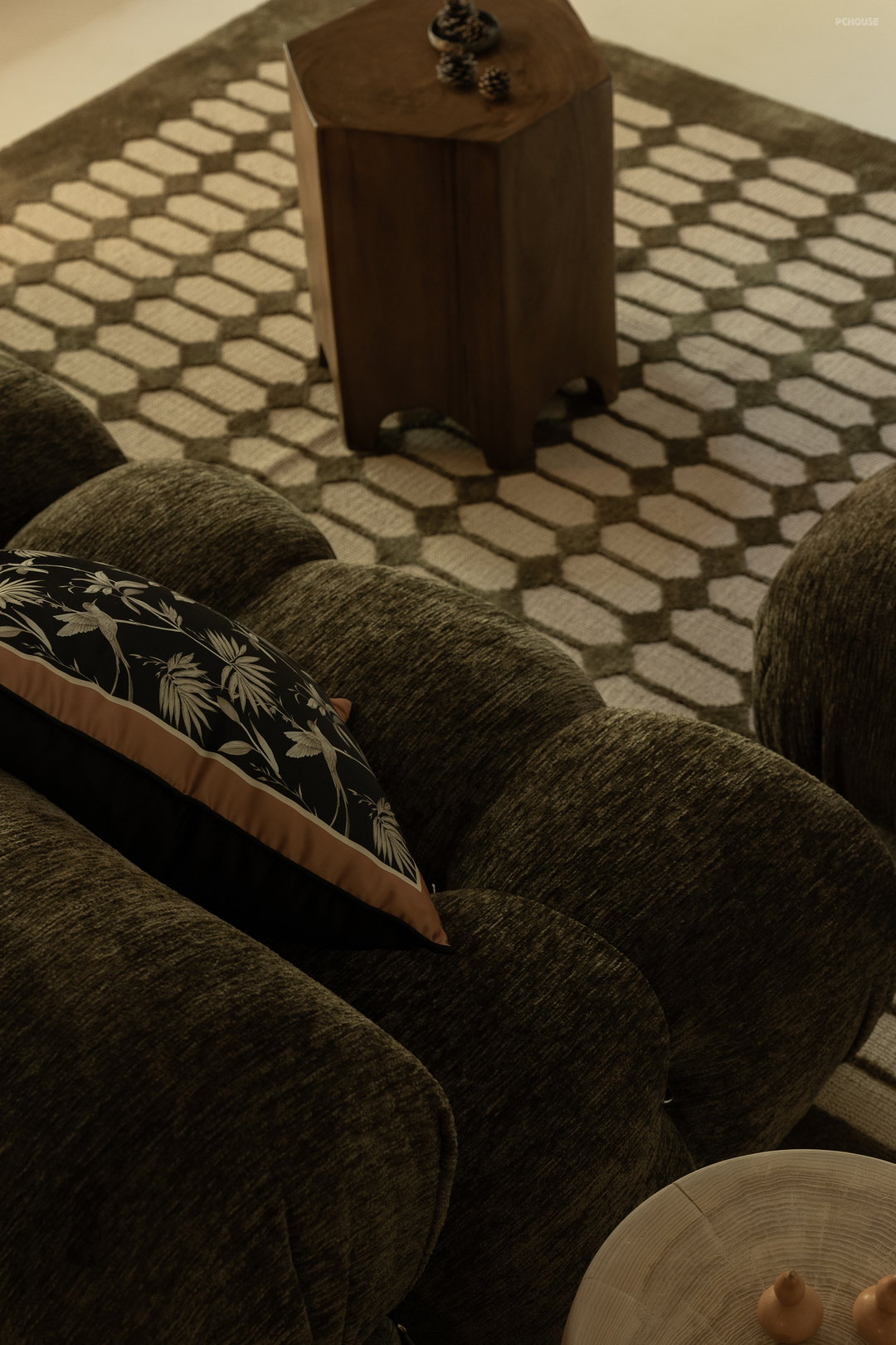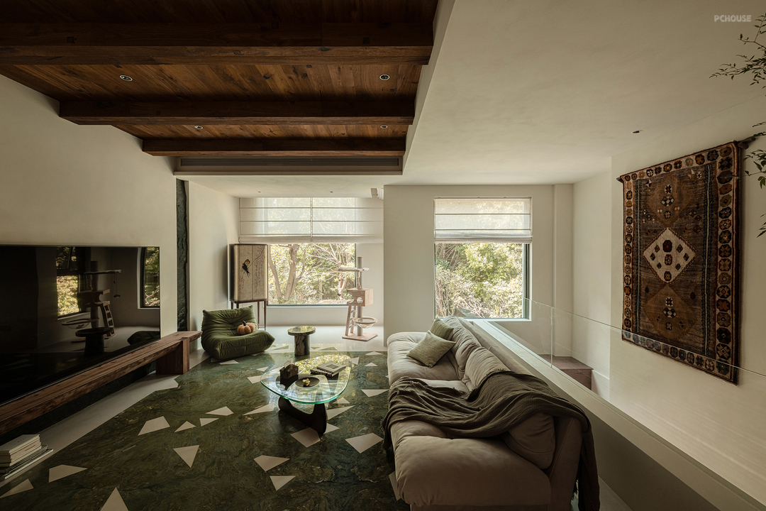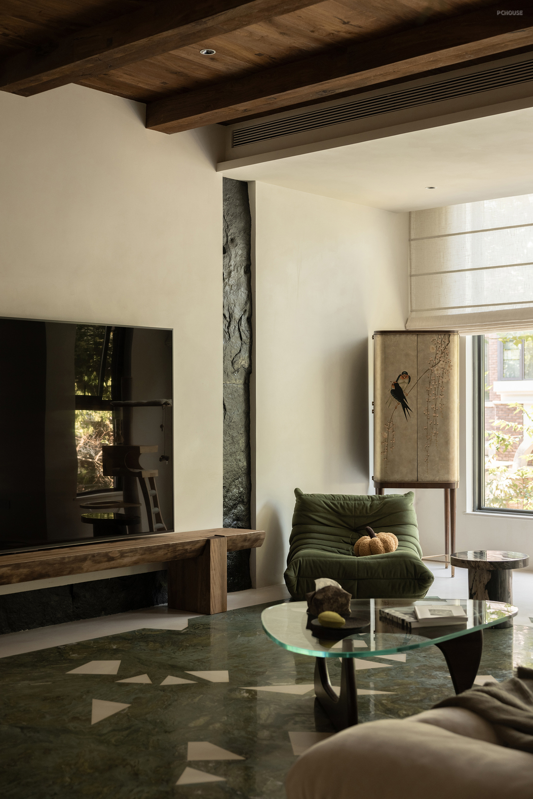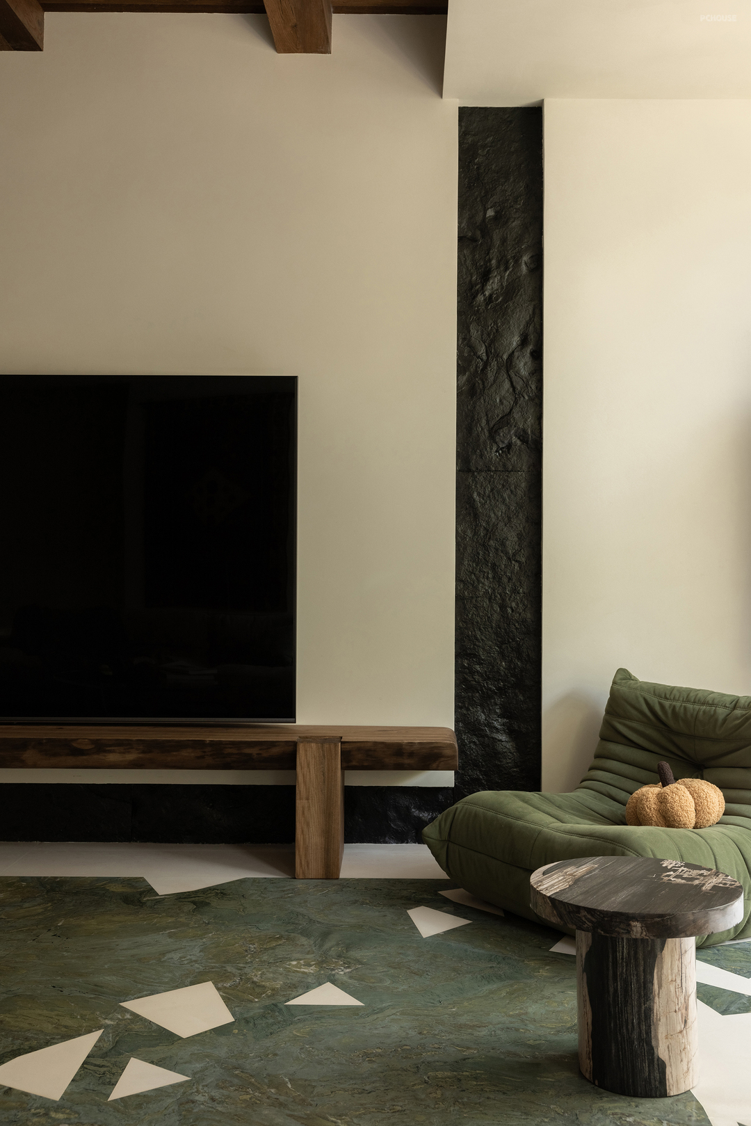 步入下沉式客厅,地面用翡翠绿与浅白色石材进行拼贴,形成了一块“天然地毯”,无需担心猫咪的抓挠或毛发的清理。电视墙面用石材做线条性点缀,视觉上营造出层次感。