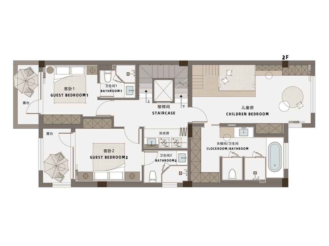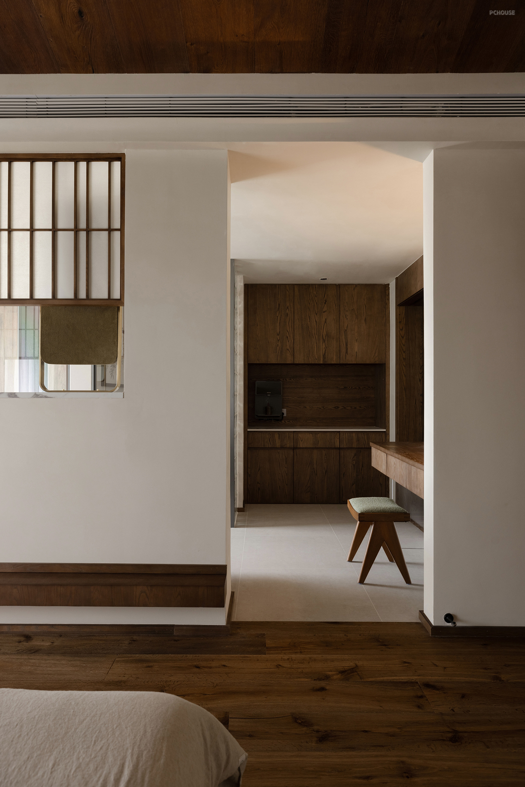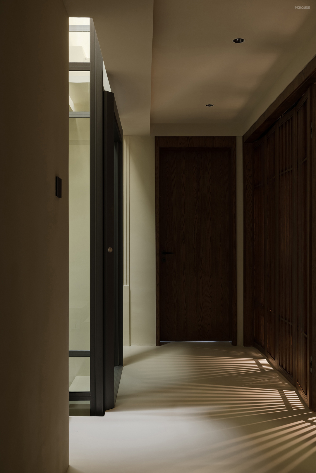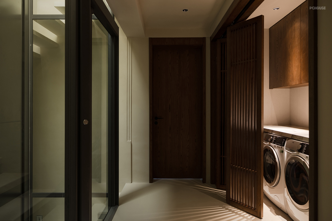 二层是次卧与儿童房,通过折叠式隔断将洗衣房巧妙地隐藏在走廊中,保持空间的整洁统一。