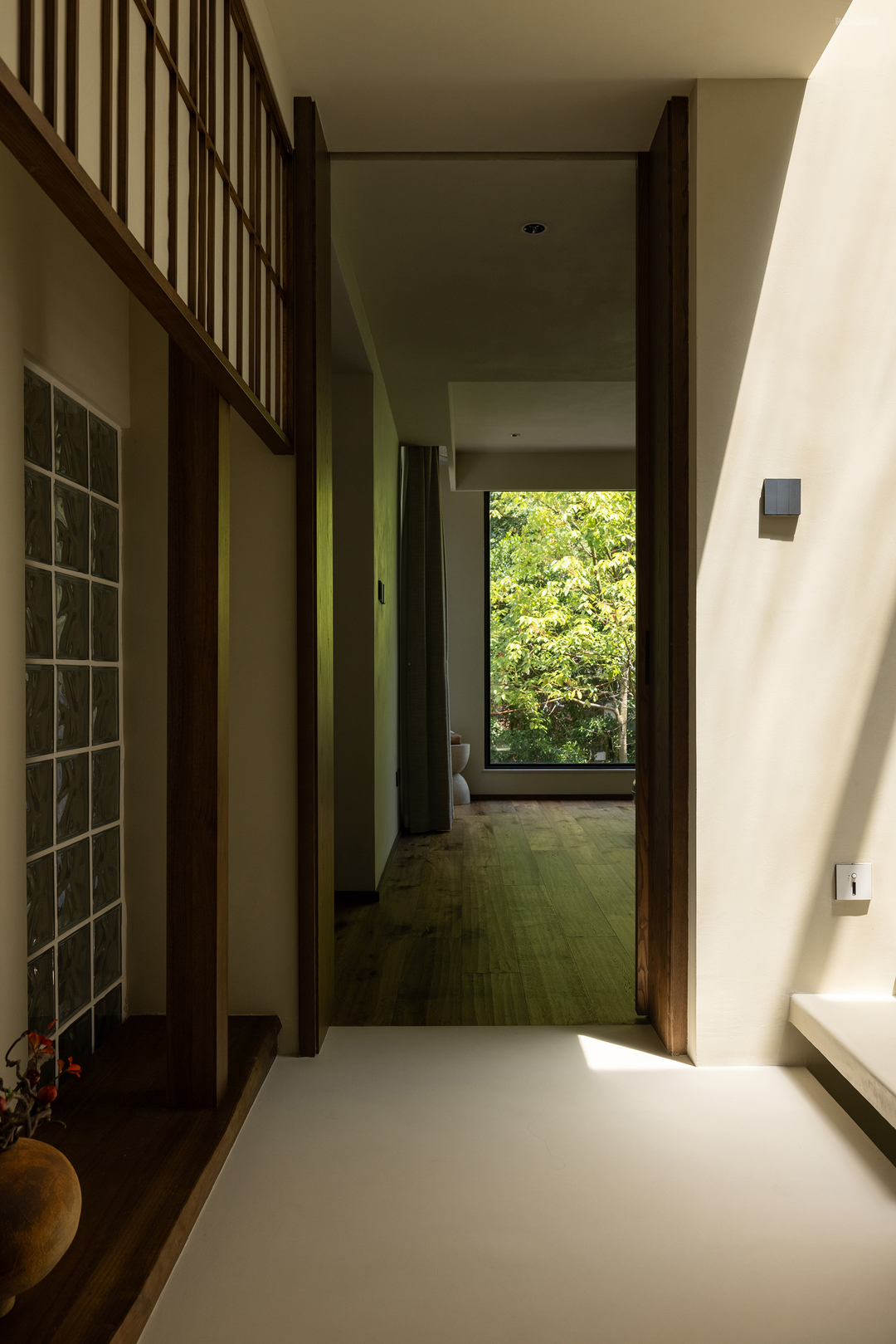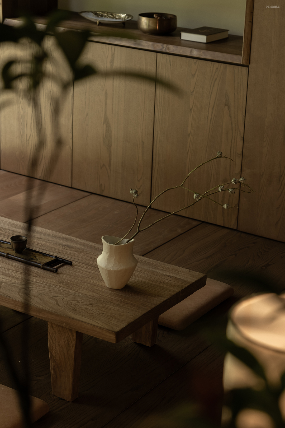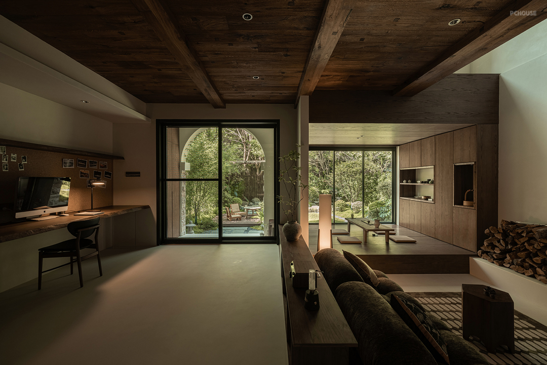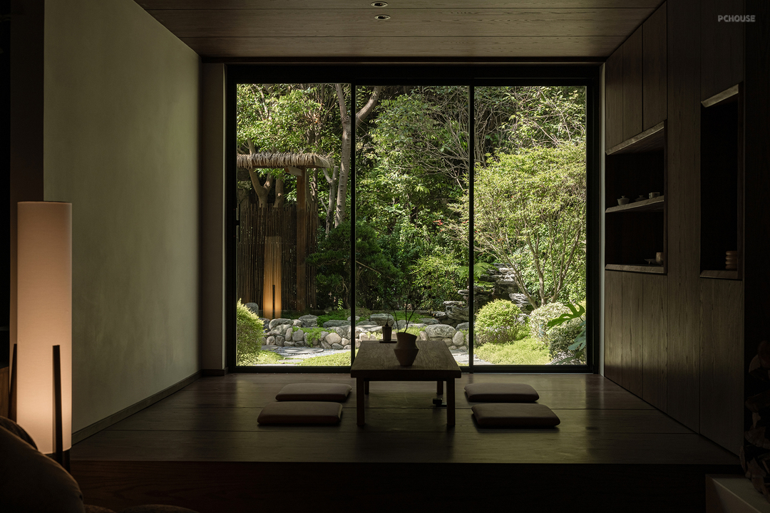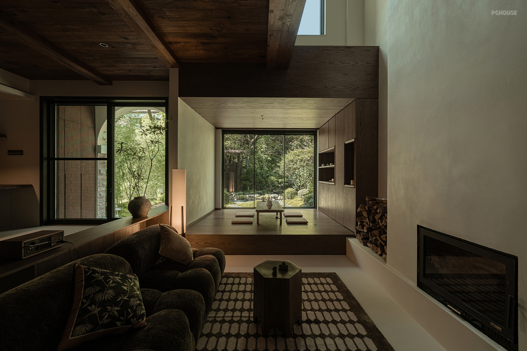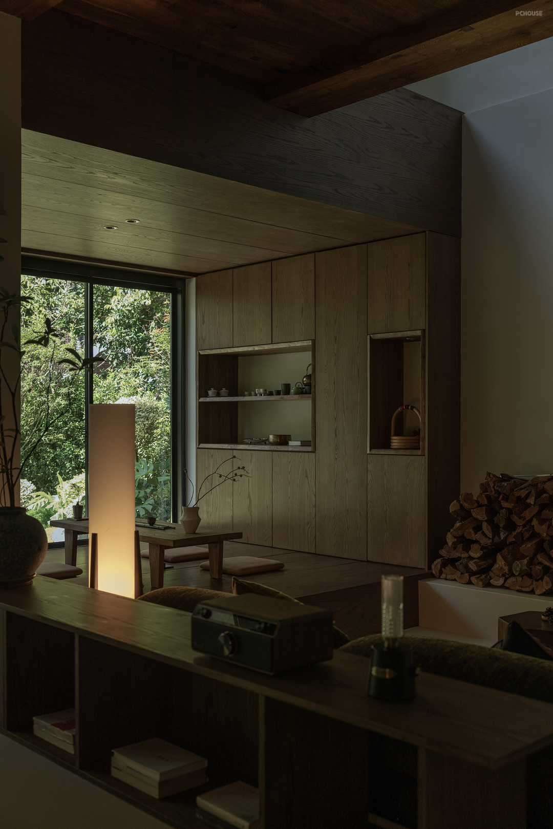 将一个木盒子嵌入空间中,并抬高地面形成榻榻米居心地。用深色的木质包裹,将大自然的宁静与厚重带入室内。大面积的落地窗将外界的绿意引入室内,模糊了室内外的界限,仿佛让人置身于自然之中。