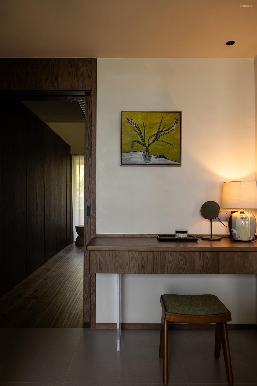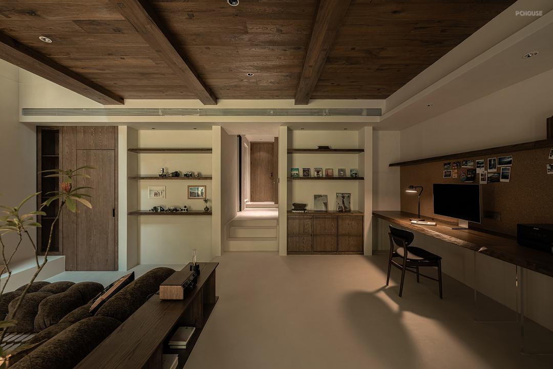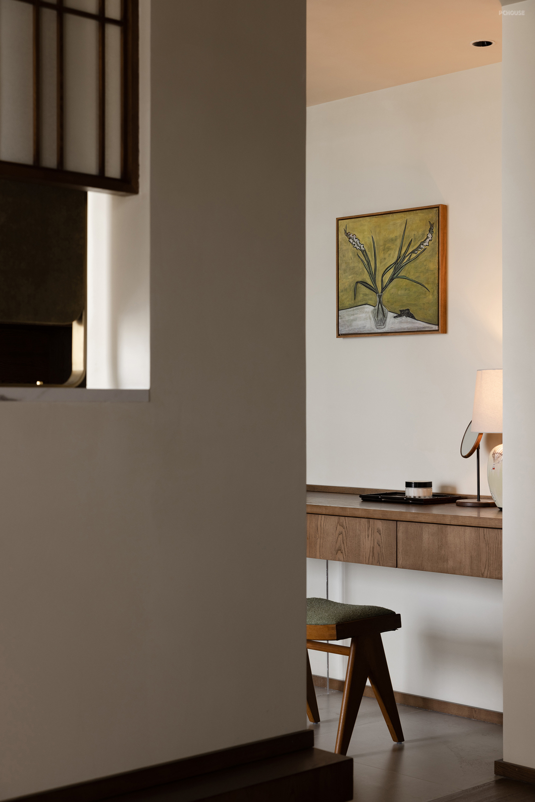 屋主一家热爱摄影和旅行,家中收藏了许多相机和大量旅行照片,书房便承载了关于相机和旅行的一切。一个长而宽的台面,可供多人同时使用。墙面大面积采用软木板作为背景,增强视觉轮廓的同时,又是一本厚重的相册,每一次旅行的记忆都留存在此,承载着时光的痕迹。