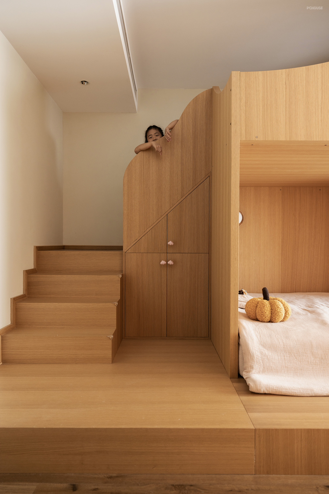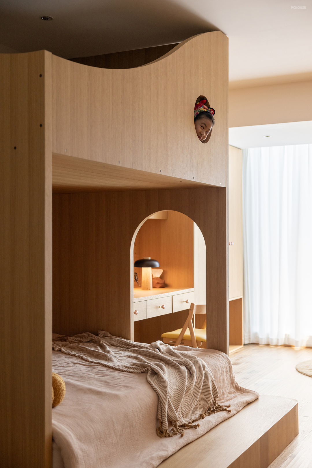 儿童房定制了上下两层活动空间。上层空间私密且独立,是小朋友的专属小天地;下层为休息空间,圆洞与弧形的点缀让整个空间更具童趣,是一个充满想象力的童话世界。