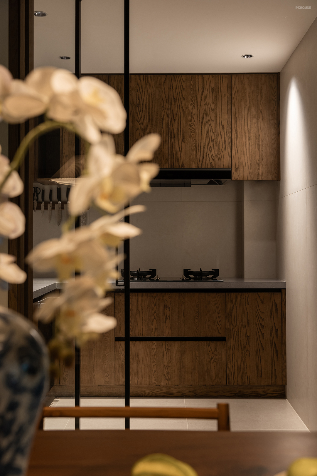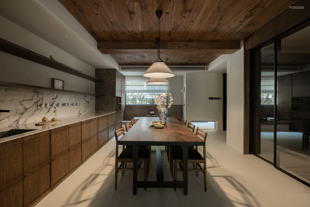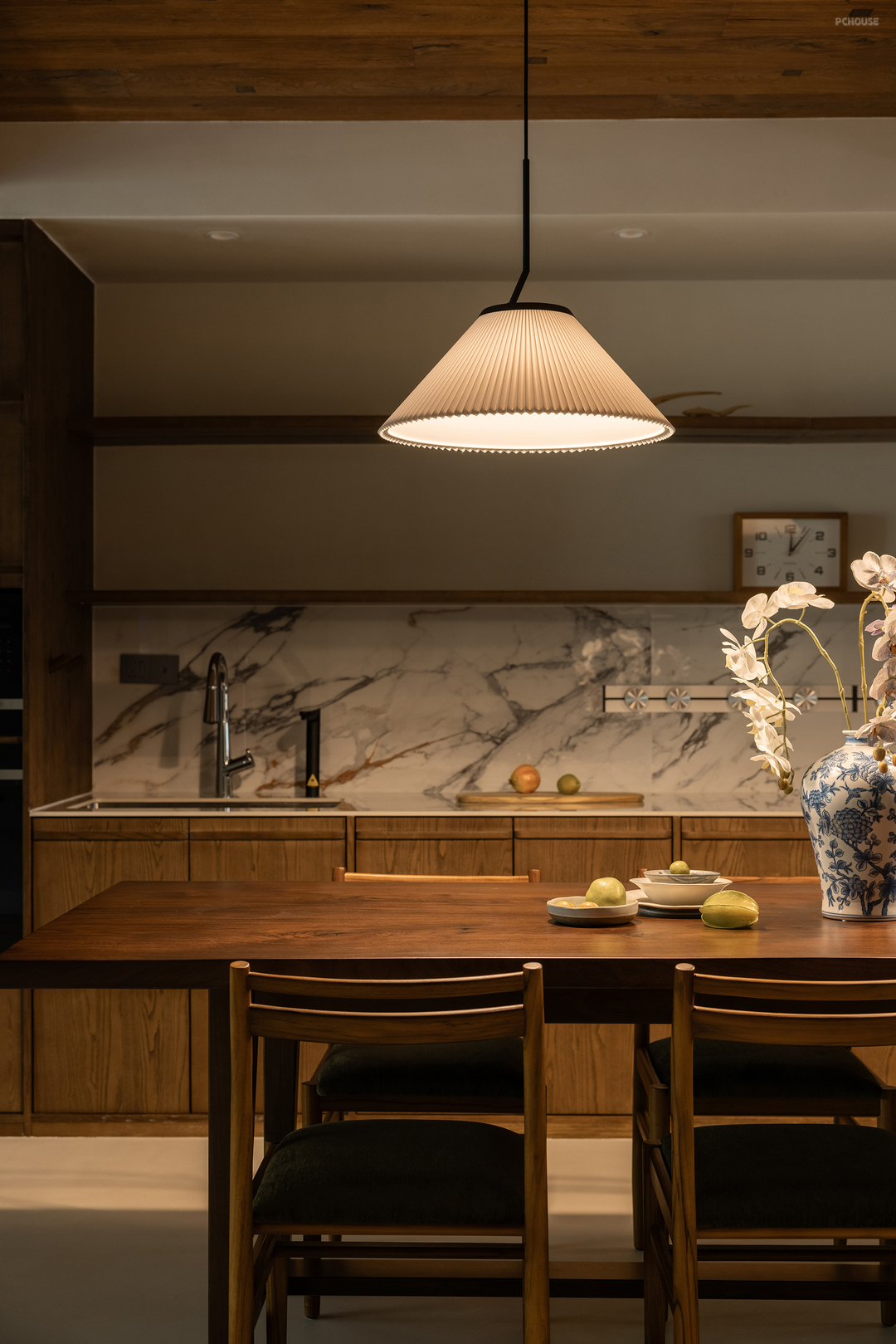 餐厅则以木色为主,开放式层架搭配柜体,形成超长的一字型操作台面和收纳空间,动线简单,空间通透。通过材质的搭配与色彩的运用,营造出温馨而舒适的用餐氛围。