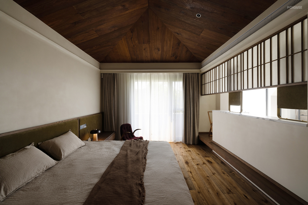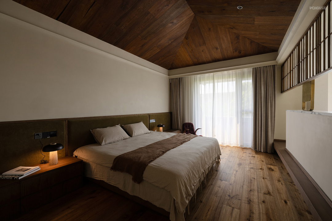 主卧保留了原始坡屋顶的独特结构,附上细腻纹理的木质板材,搭配柔软的绒面床头背景,颜色的选择上也多用绿色、棕色等从大自然中获取的颜色,与窗外的自然景观相呼应,营造出柔和舒适的居住氛围。