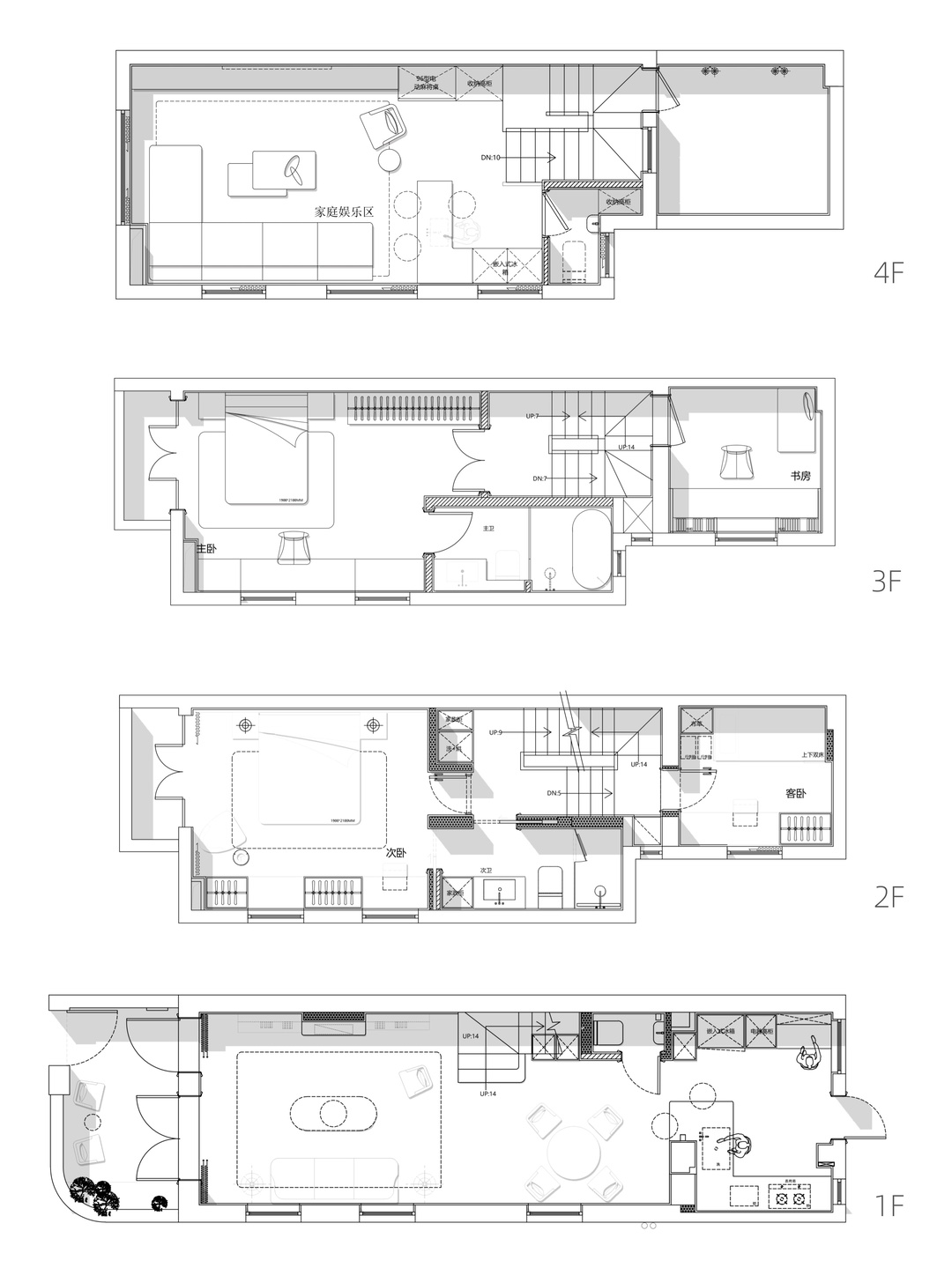 原建筑为一栋砖木结构的历史老洋房,呈长方形布局,共四层,总建筑面积为174㎡。历经近百年风雨且长期空置,内部原有构件均已严重损毁,因此在开展设计前,需对整体空间进行抢救性修复与结构加固。作为受保护的历史建筑,其内部所有梁体均须保留原貌,不可更动。于是,设计聚焦于在原有结构基础上,通过精细化的收纳设计与软装陈设融入巧思,使空间在修复重现历史风貌的同时,焕发新的生机,为后续使用注入可持续的生命力与情感张力。