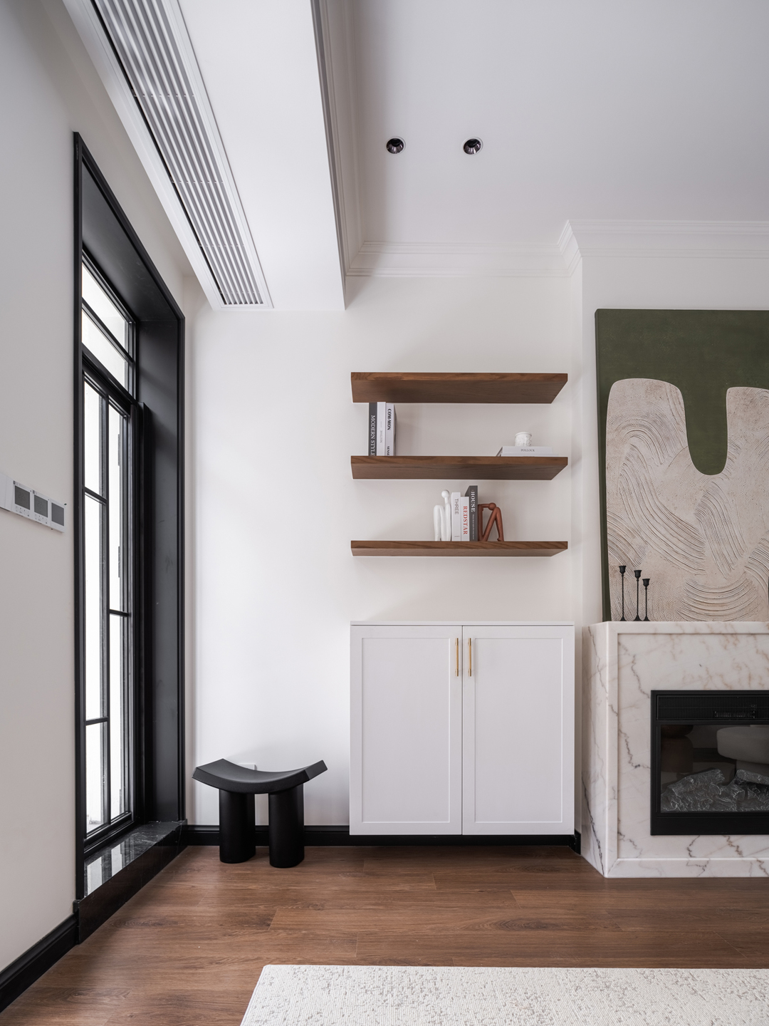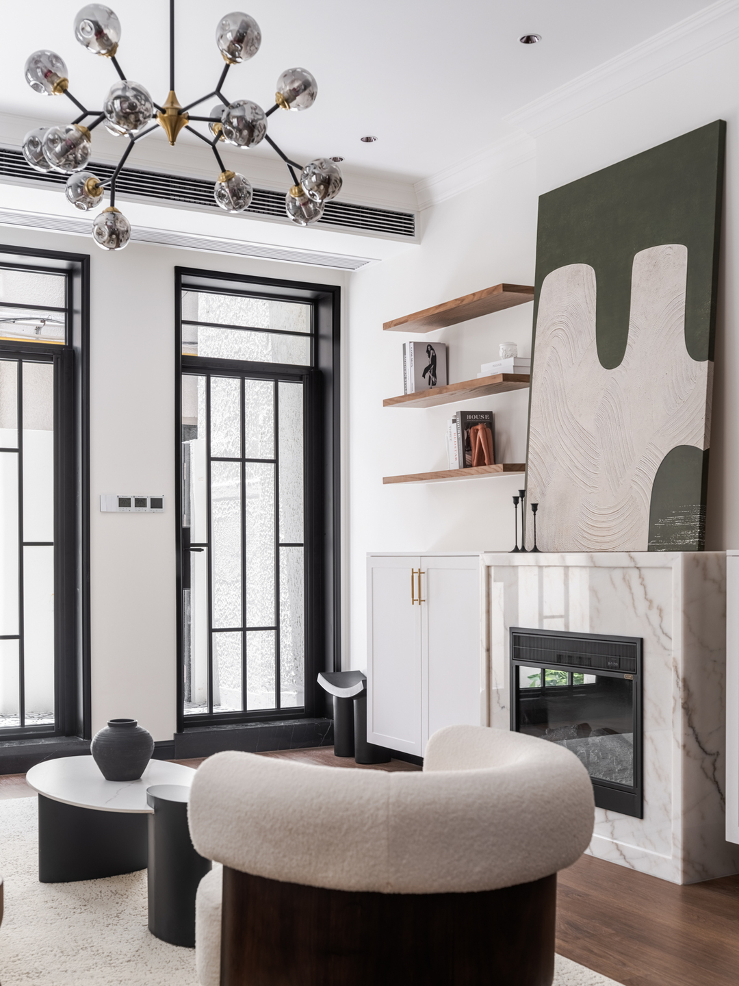 客厅的展示墙以现代壁炉与多层展架构筑出Art Deco的美学场景,一幅抽象画将克制的彩度点染于黑白灰的基底中,以解构的艺术语言同复古楼梯形成对话。它们共同平衡了前卫与典雅、沉稳与浪漫,在冲突与和谐之间建立起视觉的静谧感。白色丝绒沙发、黑色细框窗扇、精心修复的老楼梯……每一处细节都似有故事溢出,悠久历史与美式风情在空气中缓慢流淌、低语。