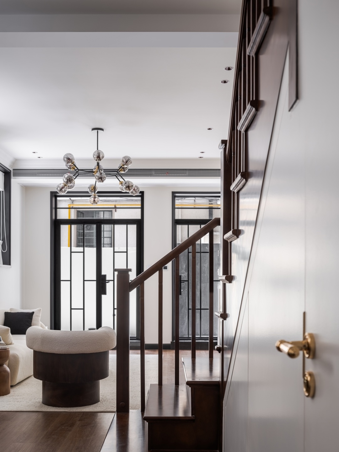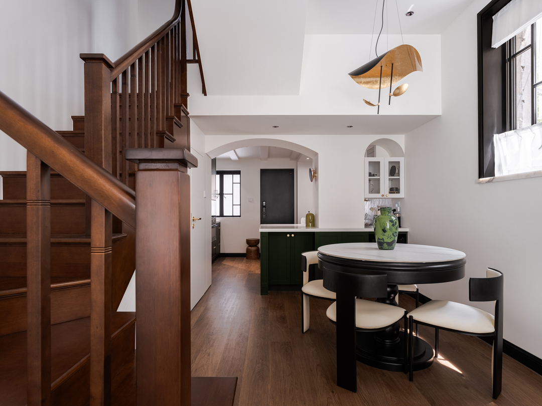 客厅以素净的白色为主题,被完整保留的复古楼梯与欧式铁艺花窗成为时空的媒介,将人的思绪轻轻接引至百年前的上海。一股浓得化不开的怀旧气息弥漫其间,仿佛只要推开这扇窗,就能进入那段十里洋场美轮美奂的流金岁月。