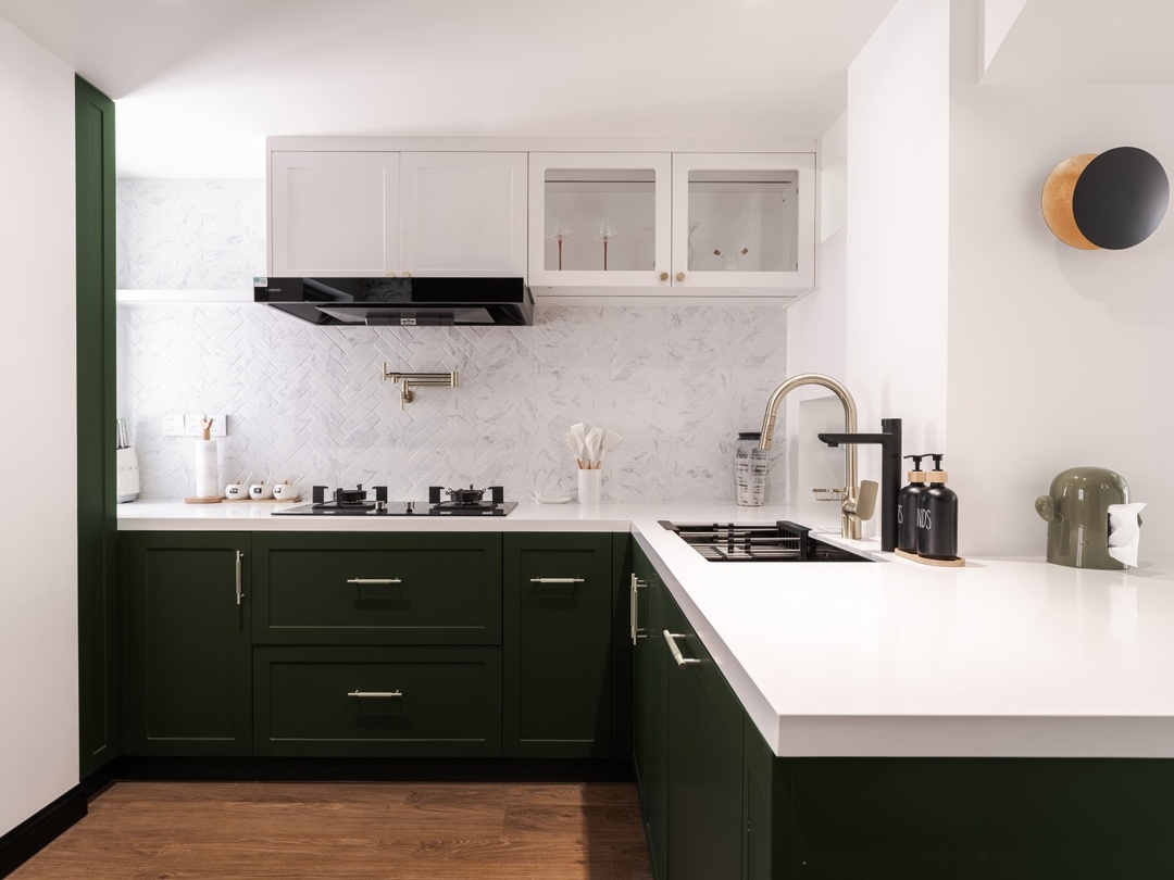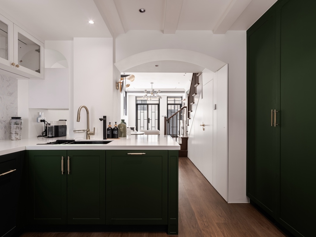 开放式厨房以一大片墨绿色为主调,这颜色既有温润的醇厚,又不失清透的张力。它仿佛自幽深林间悄然弥漫而出的一缕芳香,在复古的语境中自在流动,神秘中透出几分明朗,为整个空间定下静谧而高雅的基调。置身这个场域,仿佛仍可触摸到那未曾走远的、风韵独具的往日时光。
