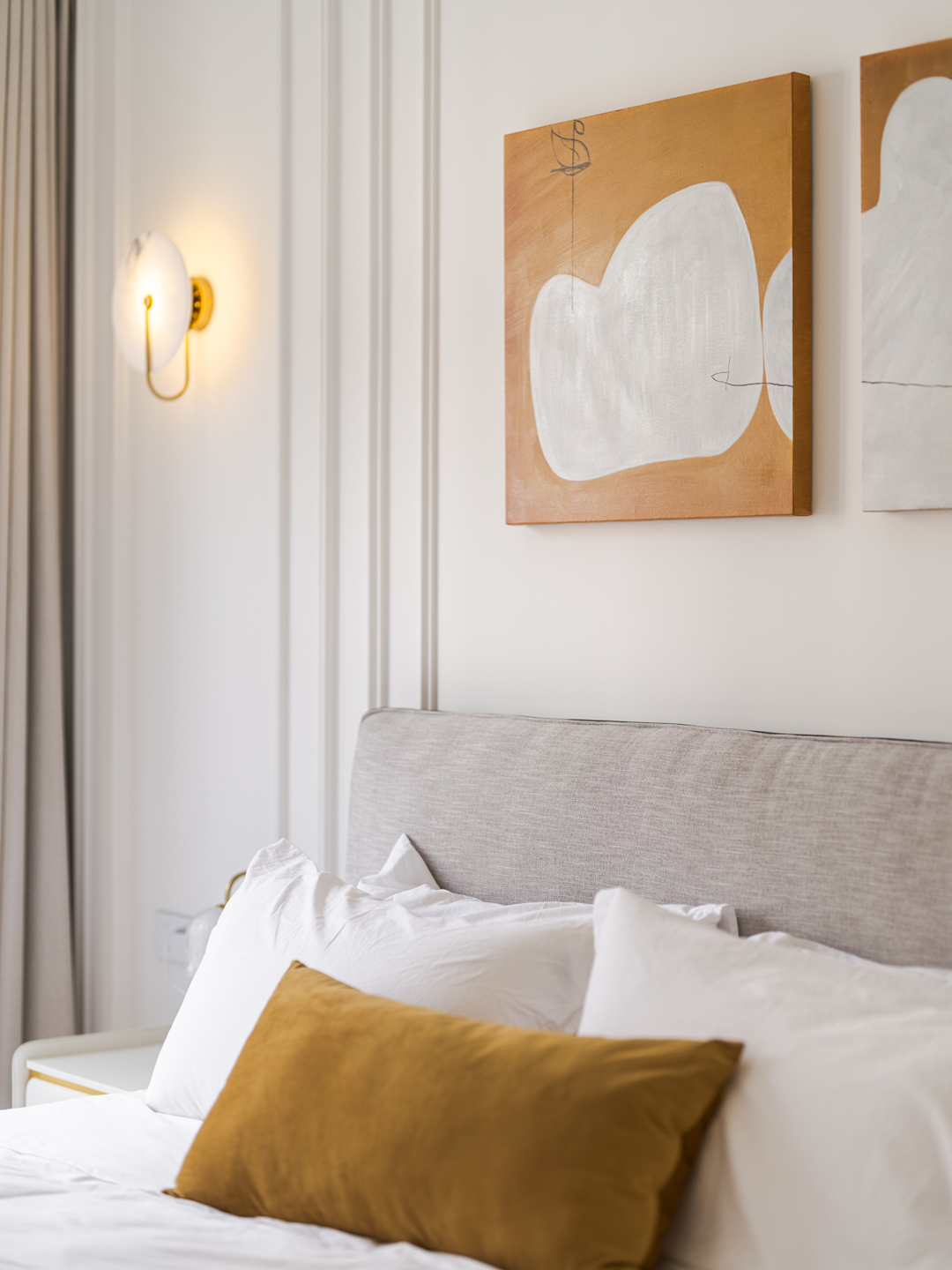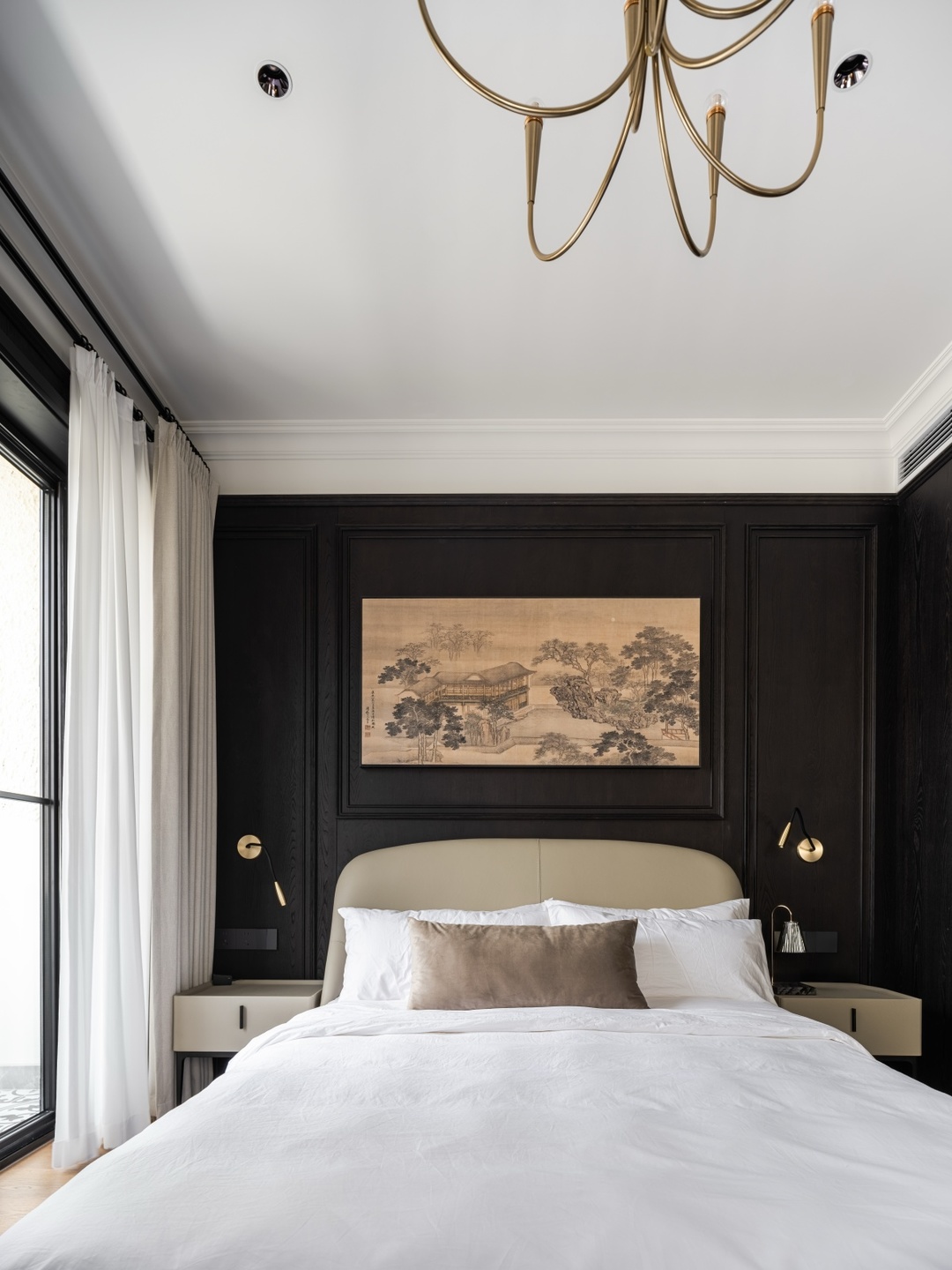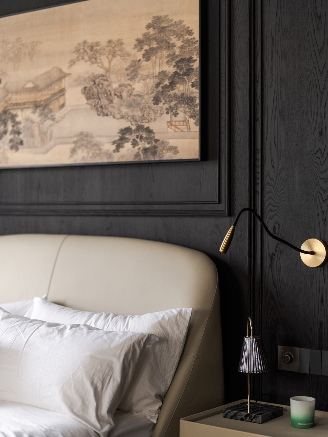 床头背景墙悬挂一幅宋代美学彩绘画,其极简淡雅的笔触与留白意境,为空间添了一抹东方的诗意与深远。白色床品、金色灯具与饰品,在香槟色光晕的温柔笼罩下,瞬间勾勒出高贵而宁谧的氛围。