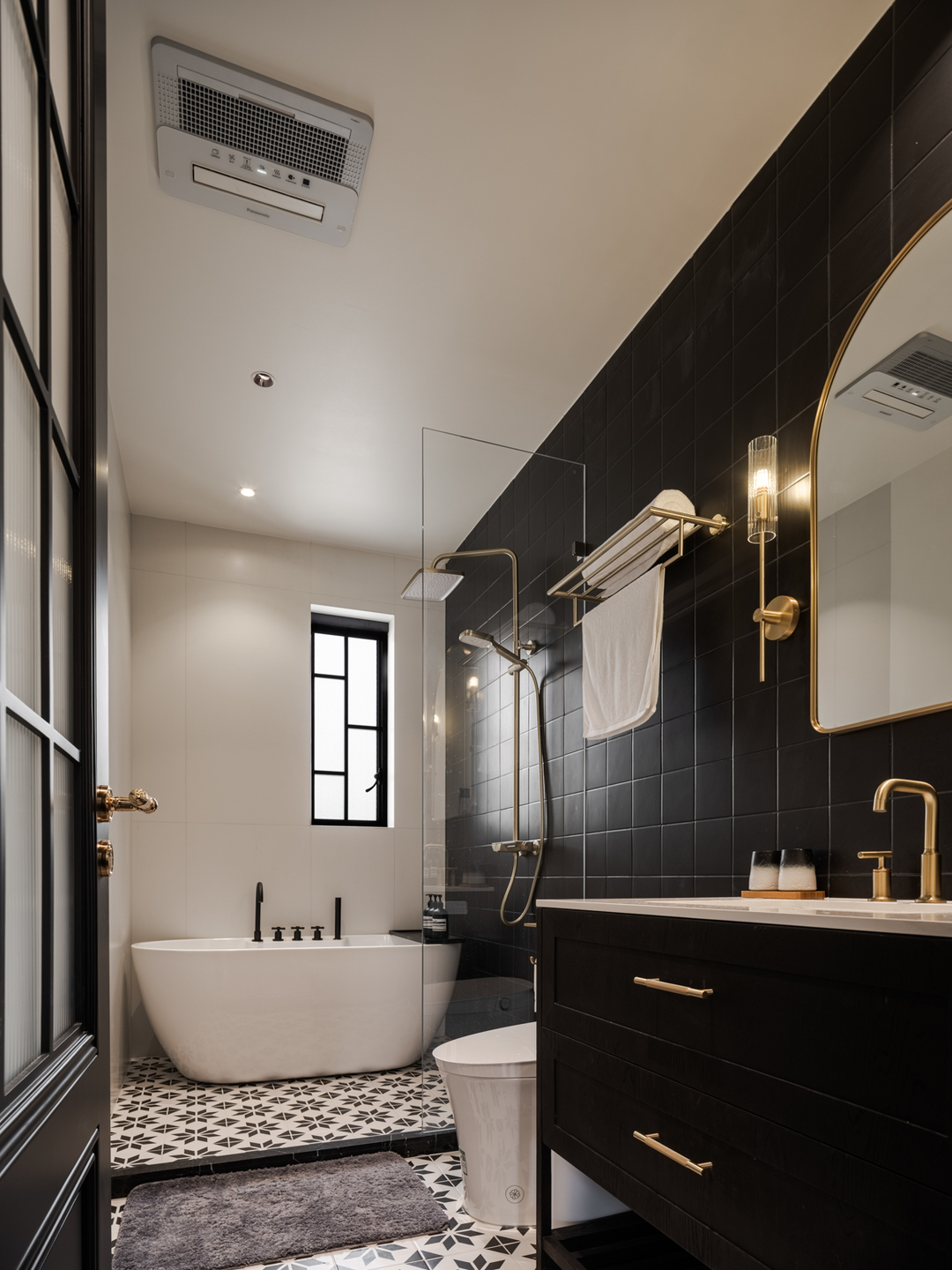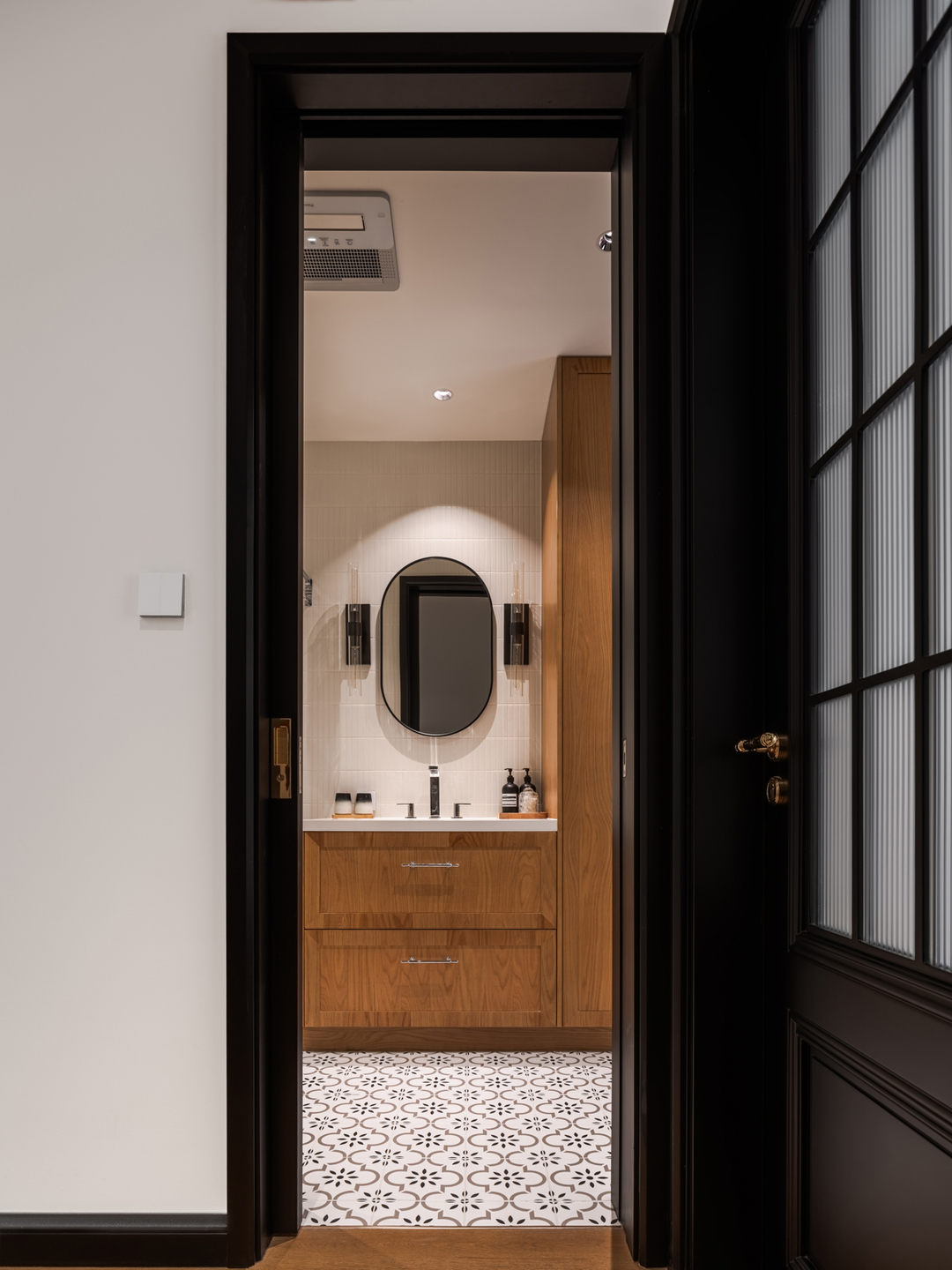 与主卧相连的主卫,延续了“黑、白、金”的复古配色逻辑。黑白花砖与黑色立体墙面砖形成鲜明对比,金属五金、镜框及龙头则以复古金色点缀,精致而不失沉稳。洗手台采用白色大理石台面与黑色木质柜体相结合,镜前两盏壁灯发出暖黄光晕,进一步提升空间的层次与仪式感。在这个极具叙事感的卫浴空间中,现代舒适与复古美学交织并存,勾勒出一种经典而耐人寻味的生活场景。
