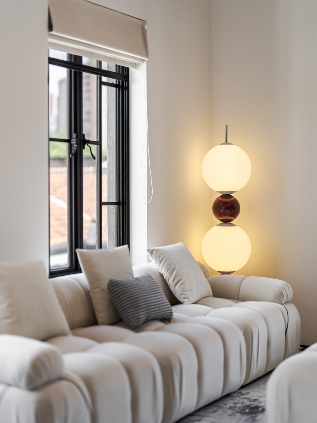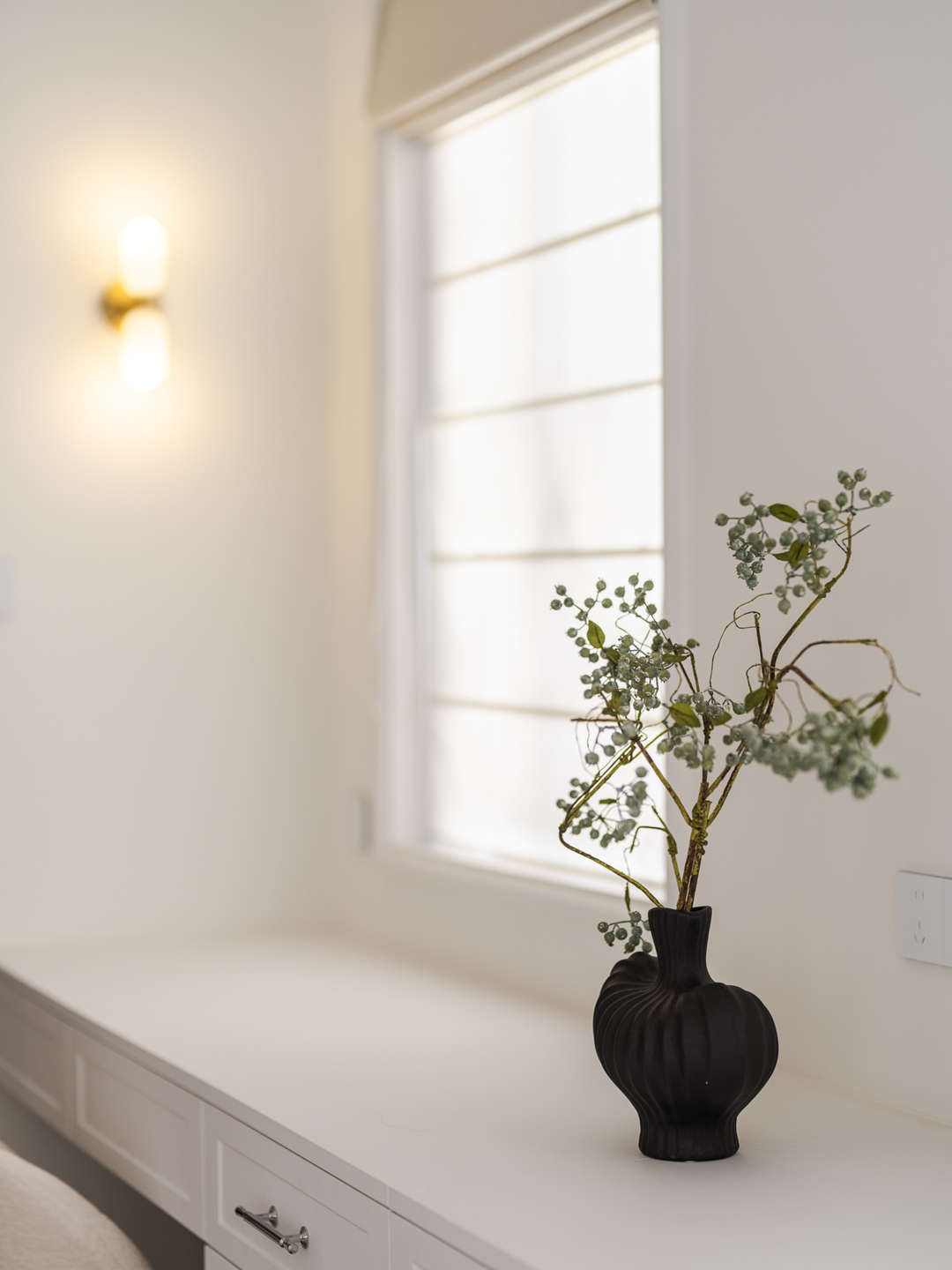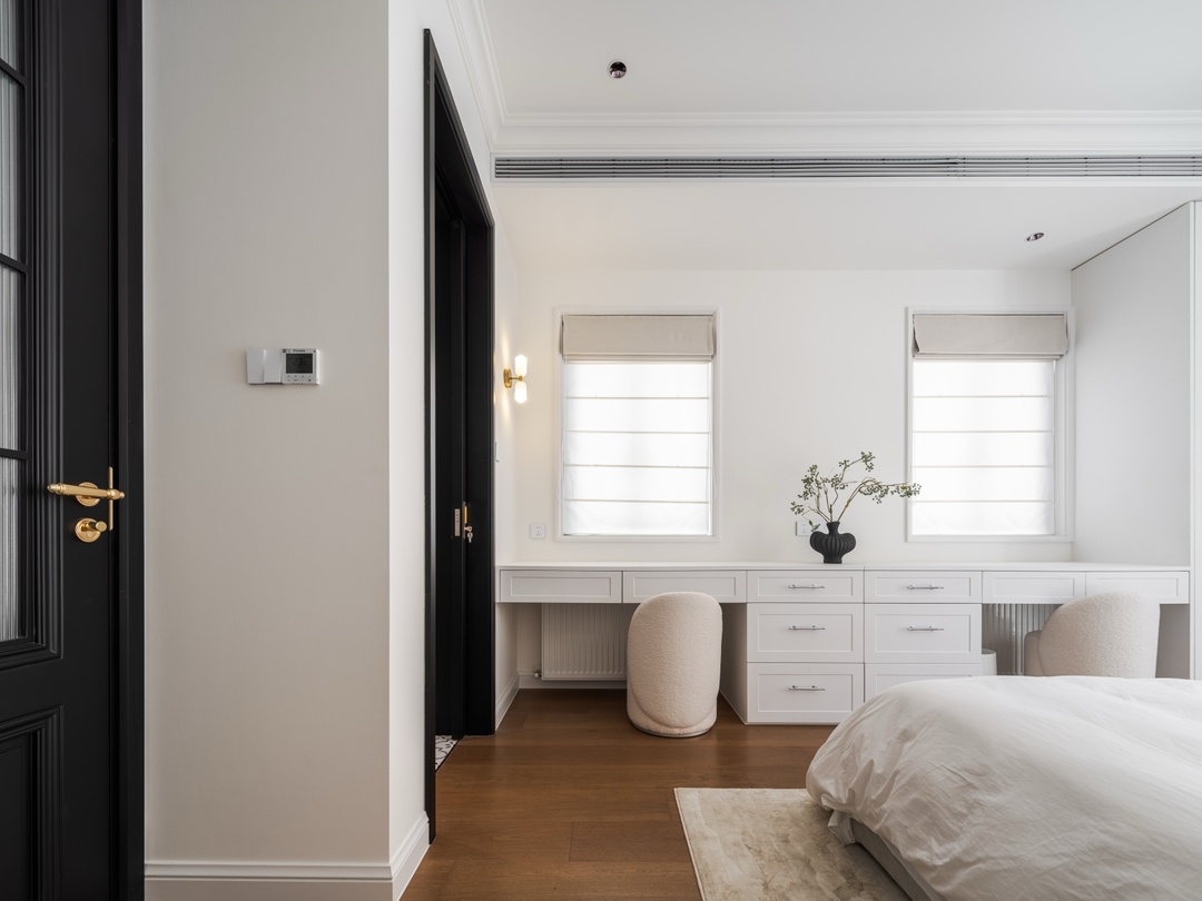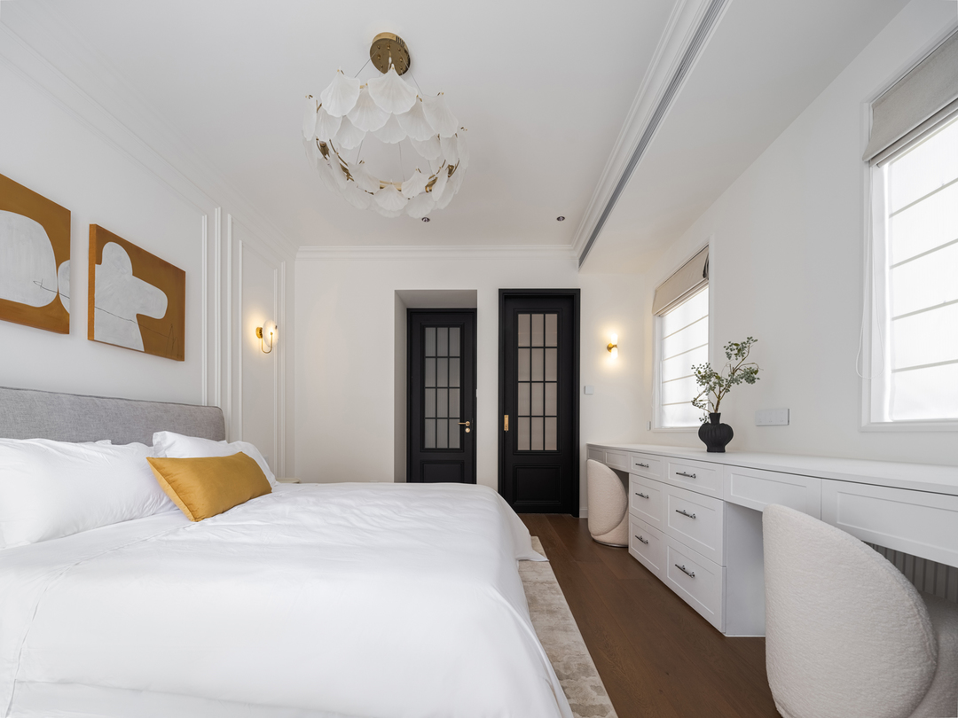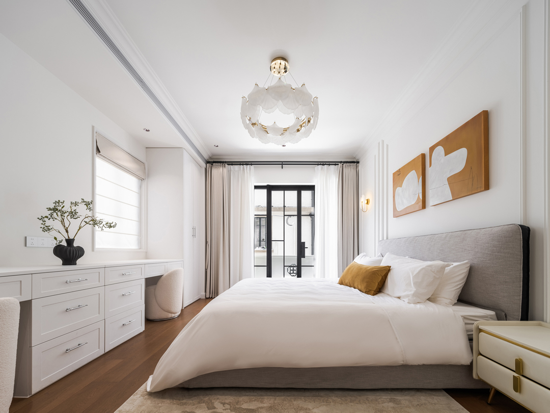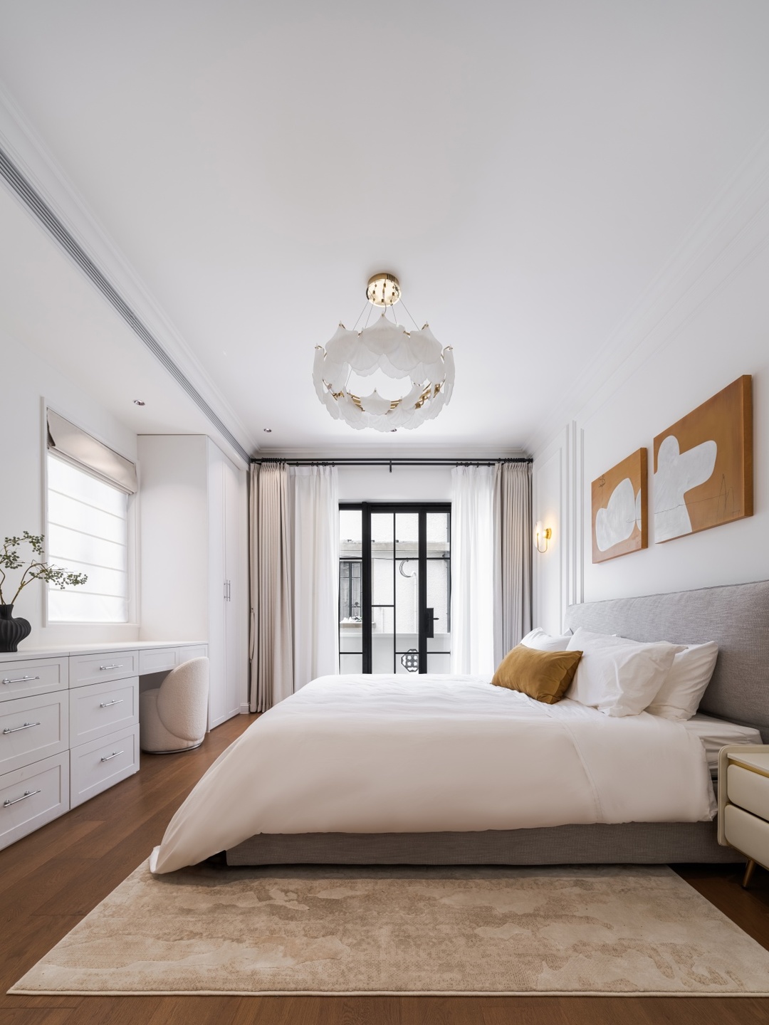 步入次卧,一个以纯白为基调的简约美式空间徐徐展开。白色云片灯轻盈悬浮,与黑色复古门窗形成清晰而克制的对话,既是对经典的致敬,亦是与现代的握手。家具的轮廓简洁而舒展,与艺术挂画默契呼应,都在细微处流露经得起时间打磨的质感。