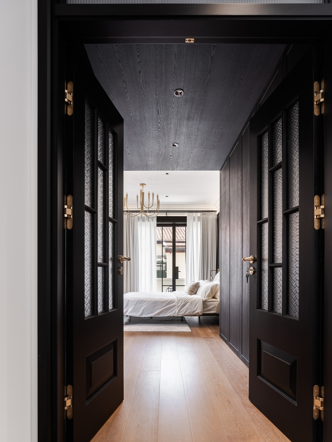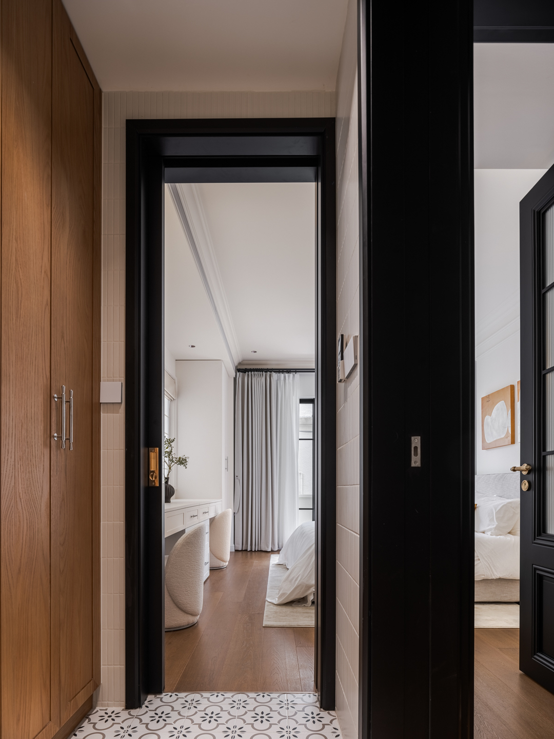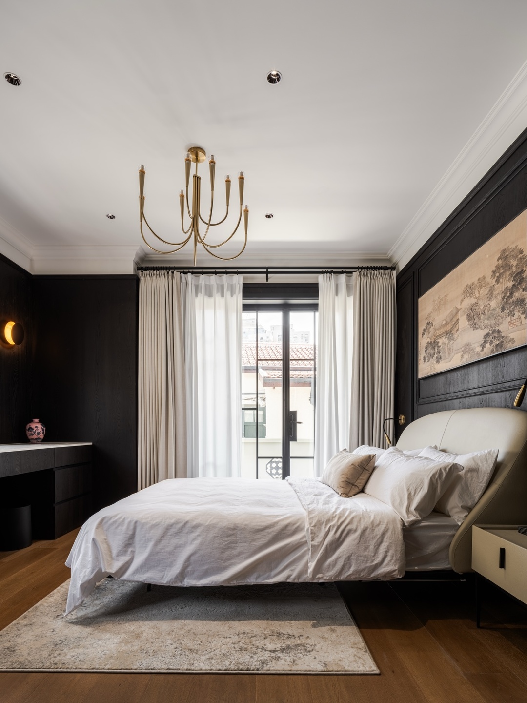 推开那对黑色双开门,仿佛开启了一段静谧而深邃的时空旅程。主卧位于三楼,以黑色为主调,与其它空间的浅色系形成强烈而迷人的反差。这扇黑色双开门,是在原有门体基础上精心修复而成。我们保留了原始门框,以延续老洋房的结构记忆,同时一比一复刻了海棠玻璃,并更换了五金件。焕然一新的木门,如同一位沉默的叙述者,在开合之间低语着时光的重量。当阳光光透过窗格轻轻洒落,光影在黑色墙面与地面之间无声流转,整个场域弥漫着一种如梦似幻的静谧之美。