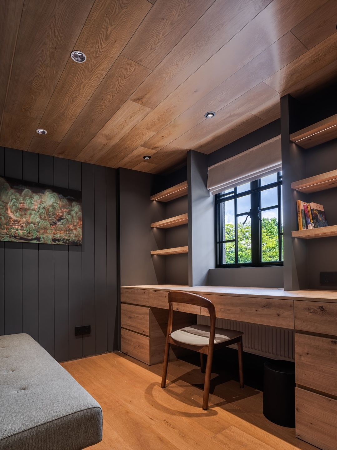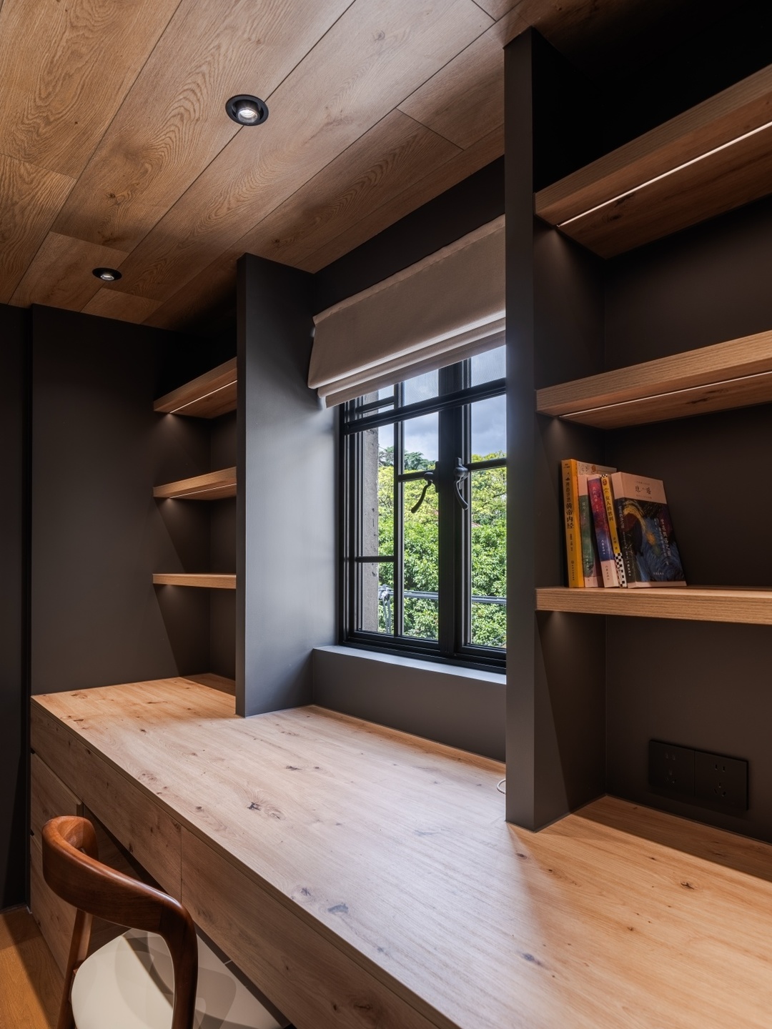 顶面与墙面摒弃繁复,以同款地板延伸视觉的深邃感,模糊了空间的边界,仿佛踏入一个被时光精心包裹的胶囊。依窗而建的书柜与书桌,将天光与景致引入案头,思想与自然于此和鸣。