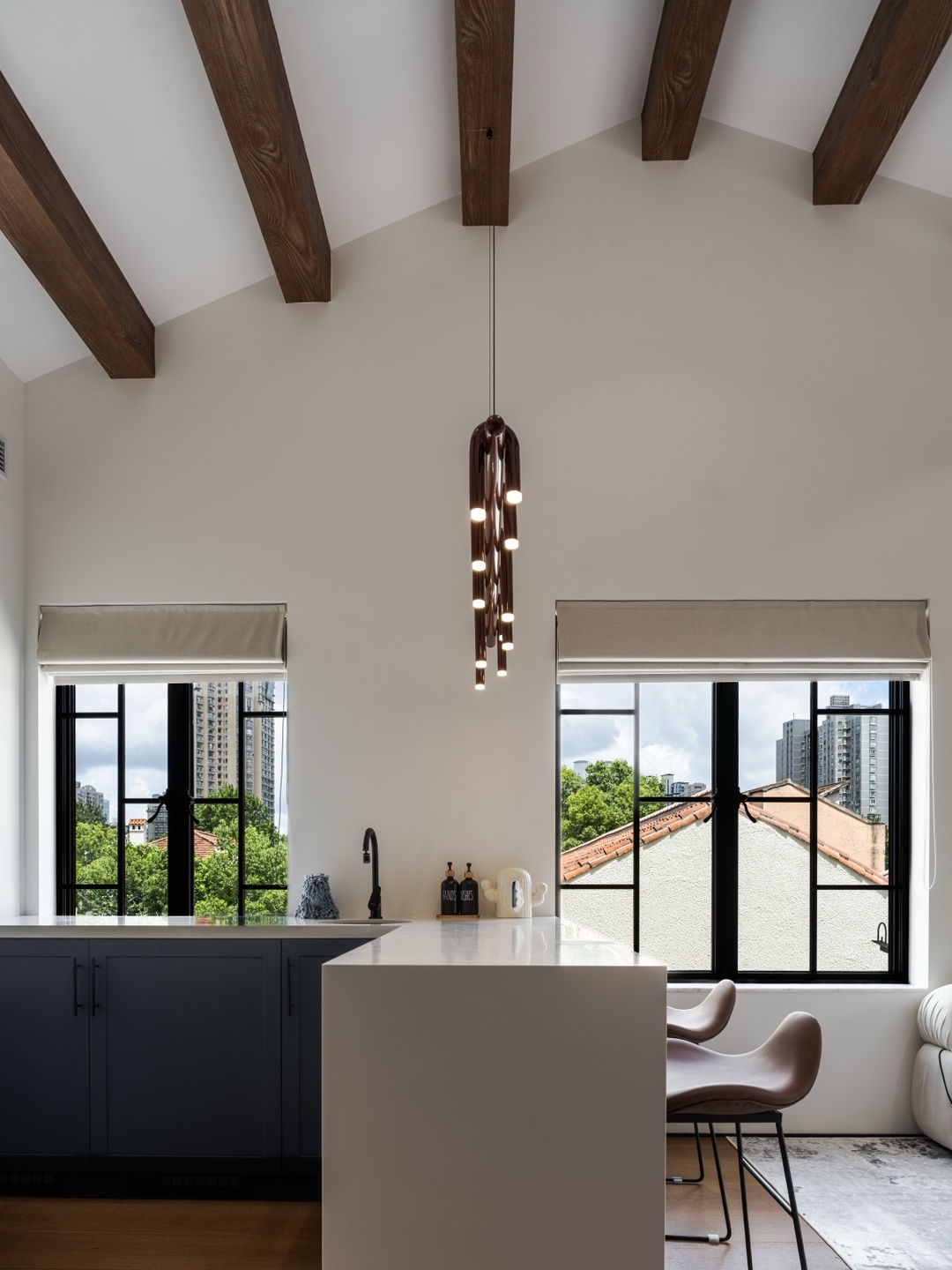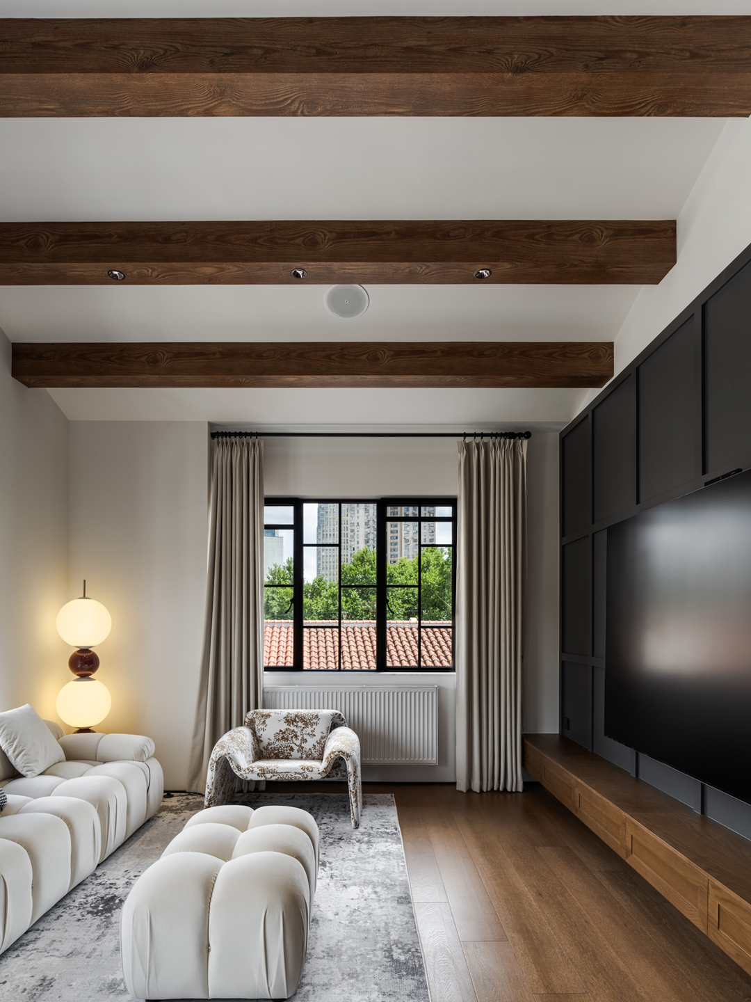 斜顶下的原始木梁被悉数保留,并借助木质肌理的贴膜得以延续新生。它们一根接一根整齐排列,宛如时间的骨架,在光影间交织出岁月的回廊。整体采用沉稳的色调,烘托出宁谧而雅致的氛围,仿佛时光在此也变得柔软、缓慢。