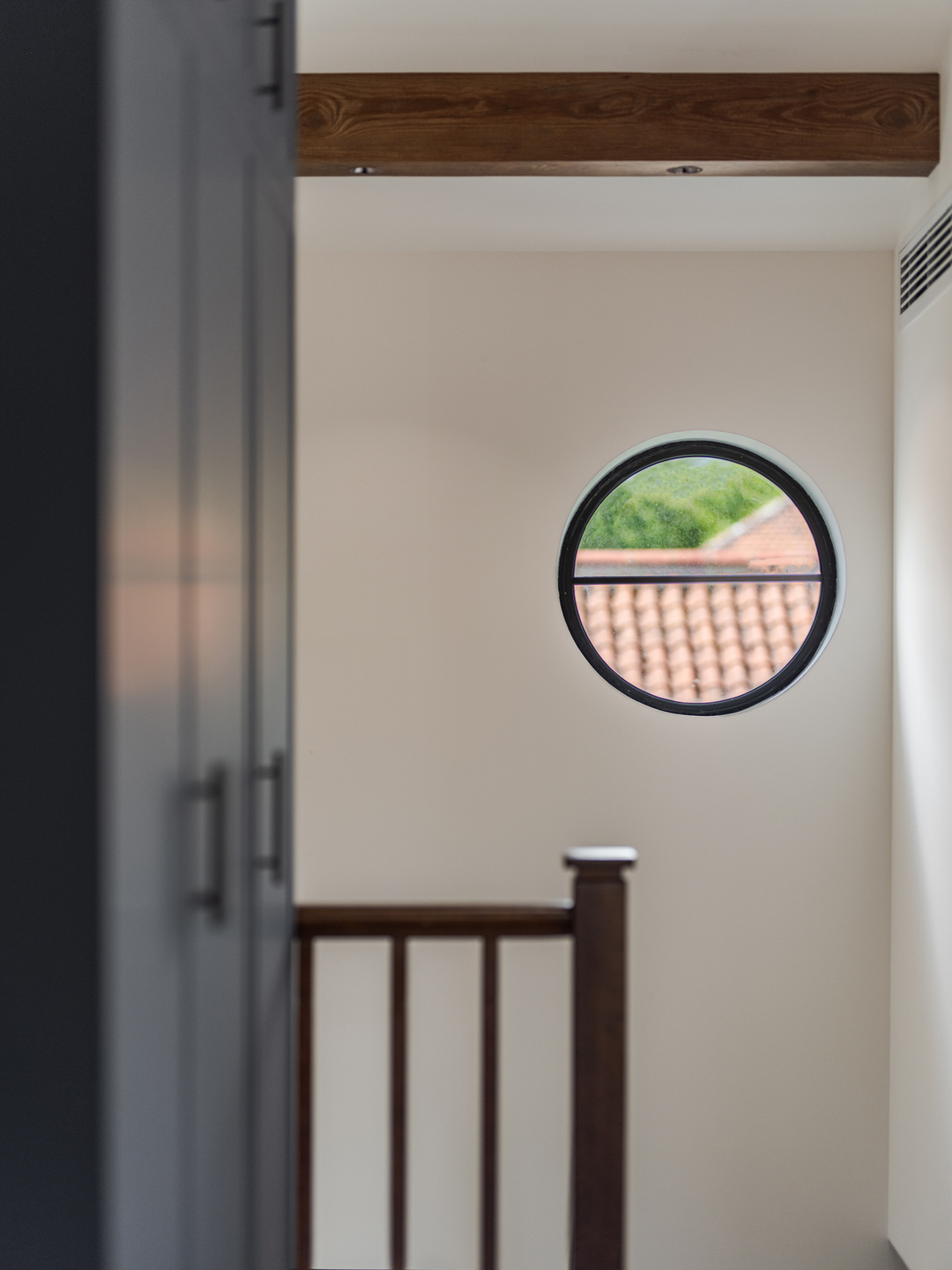 站在次卧门口俯瞰夹层空间,阳光透过窗格漫入,被细致切割成流动的光影,在白色弧形的顶面与木质地板和楼梯之间悄然游移。