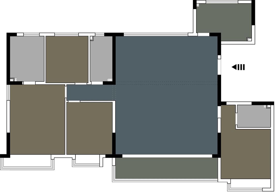 原始户型中公区面积很大,怎样分区利用并且规划好明确的生活动线成为布局改造上的重点。