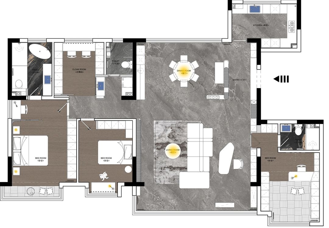 明确居住需求后,屋主将四室改为三室,北次卧作为衣帽间使用。
