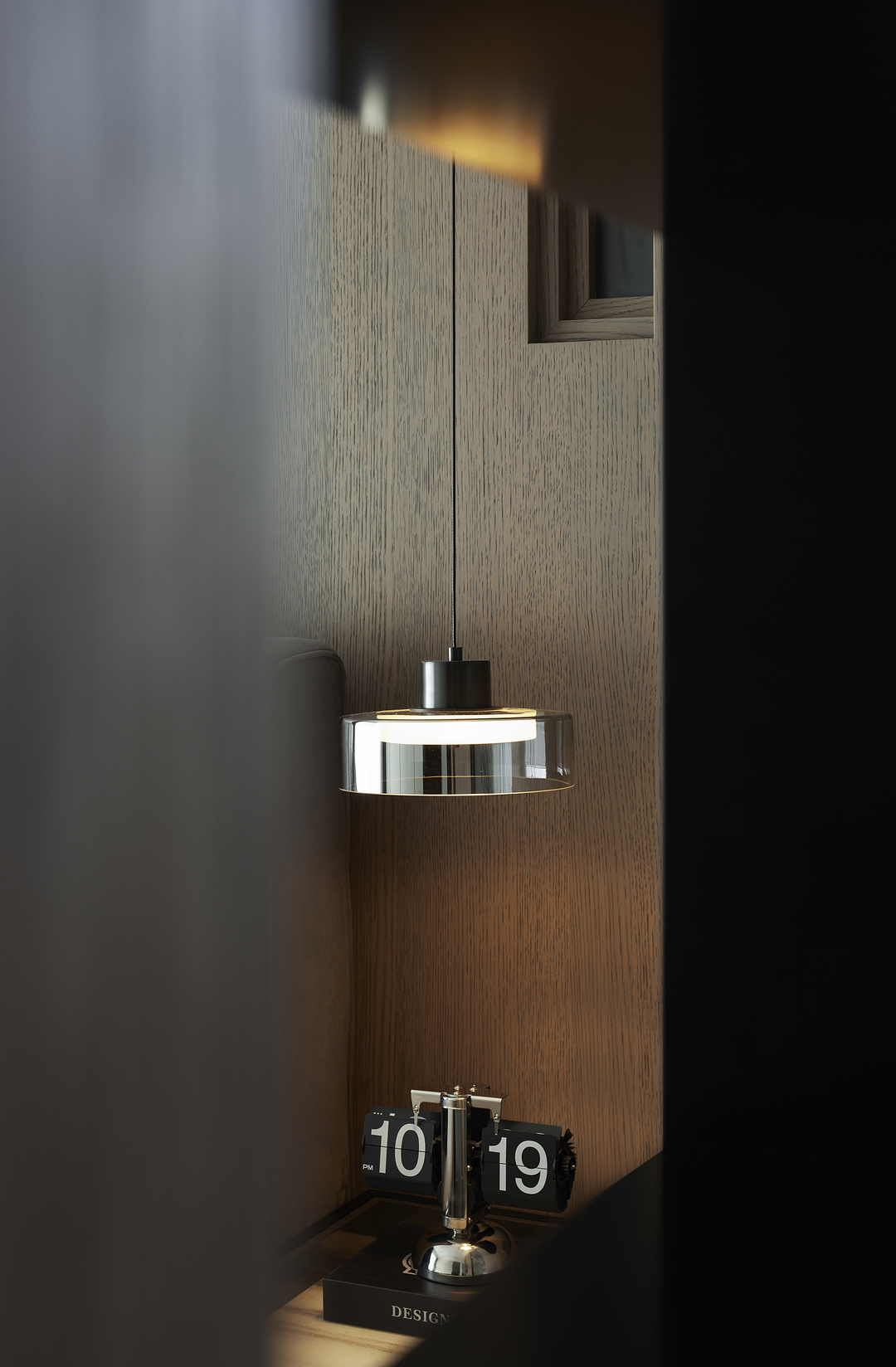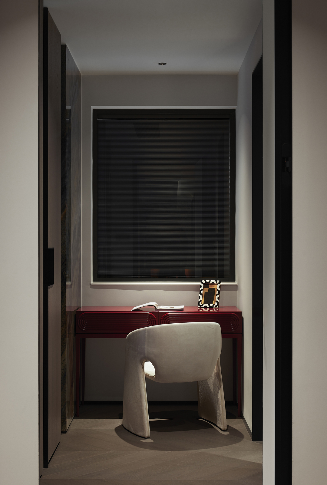 走廊延伸视觉,行走之间就有了情绪过渡的距离。屋主进入卧室时,引导通向梳妆台、卧室、主卫三种功能分区,而不是被动选择。分区之间用材质的穿插结构划分,丰富又自由。