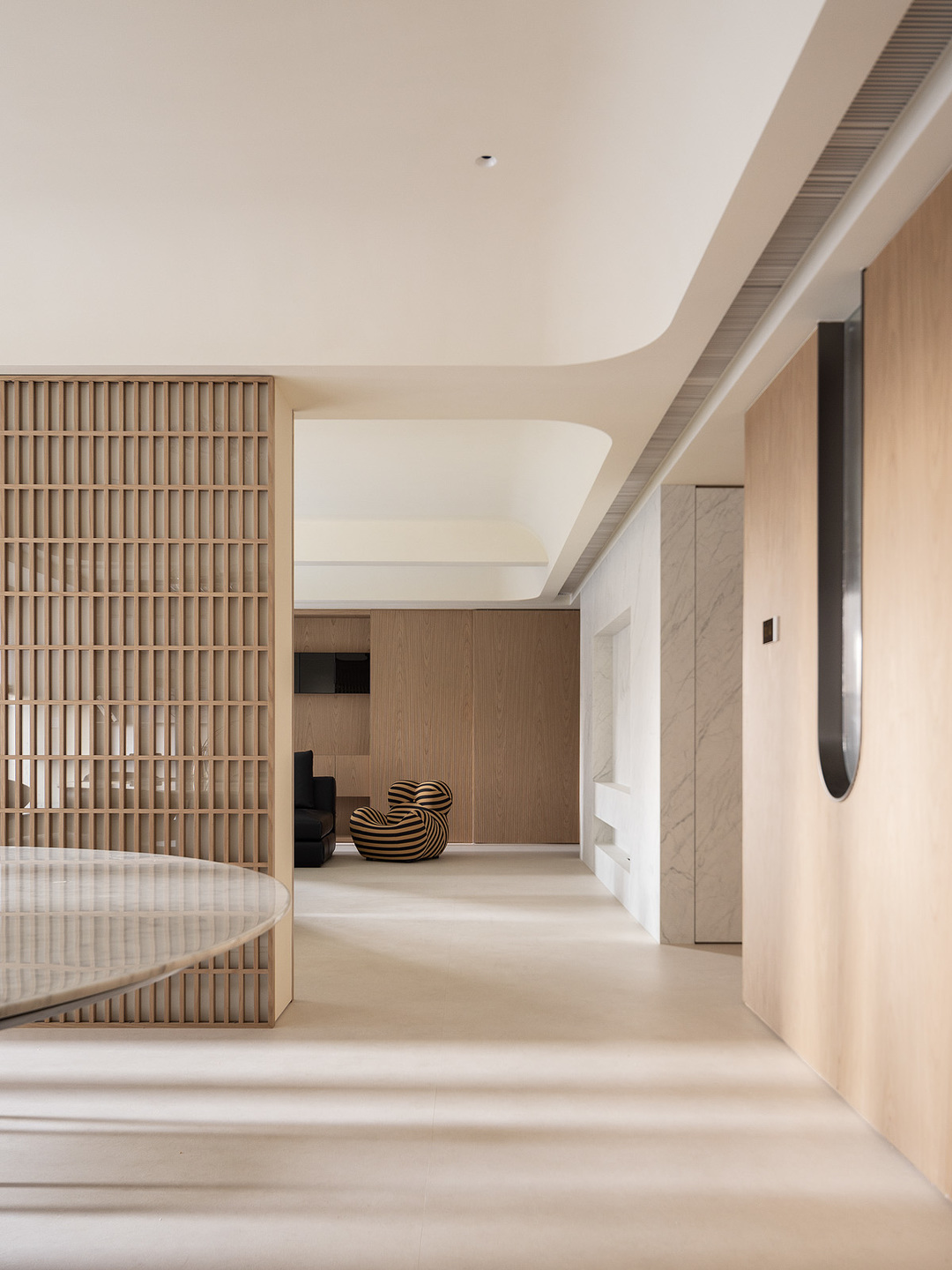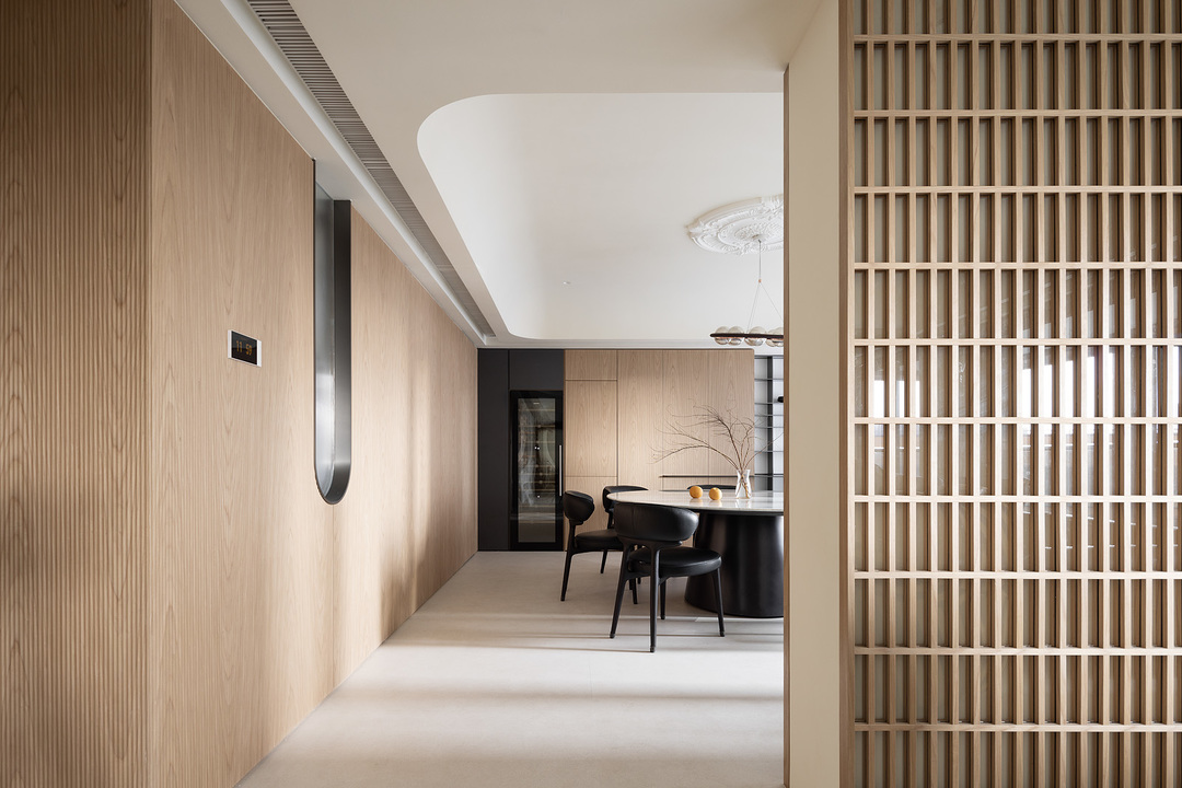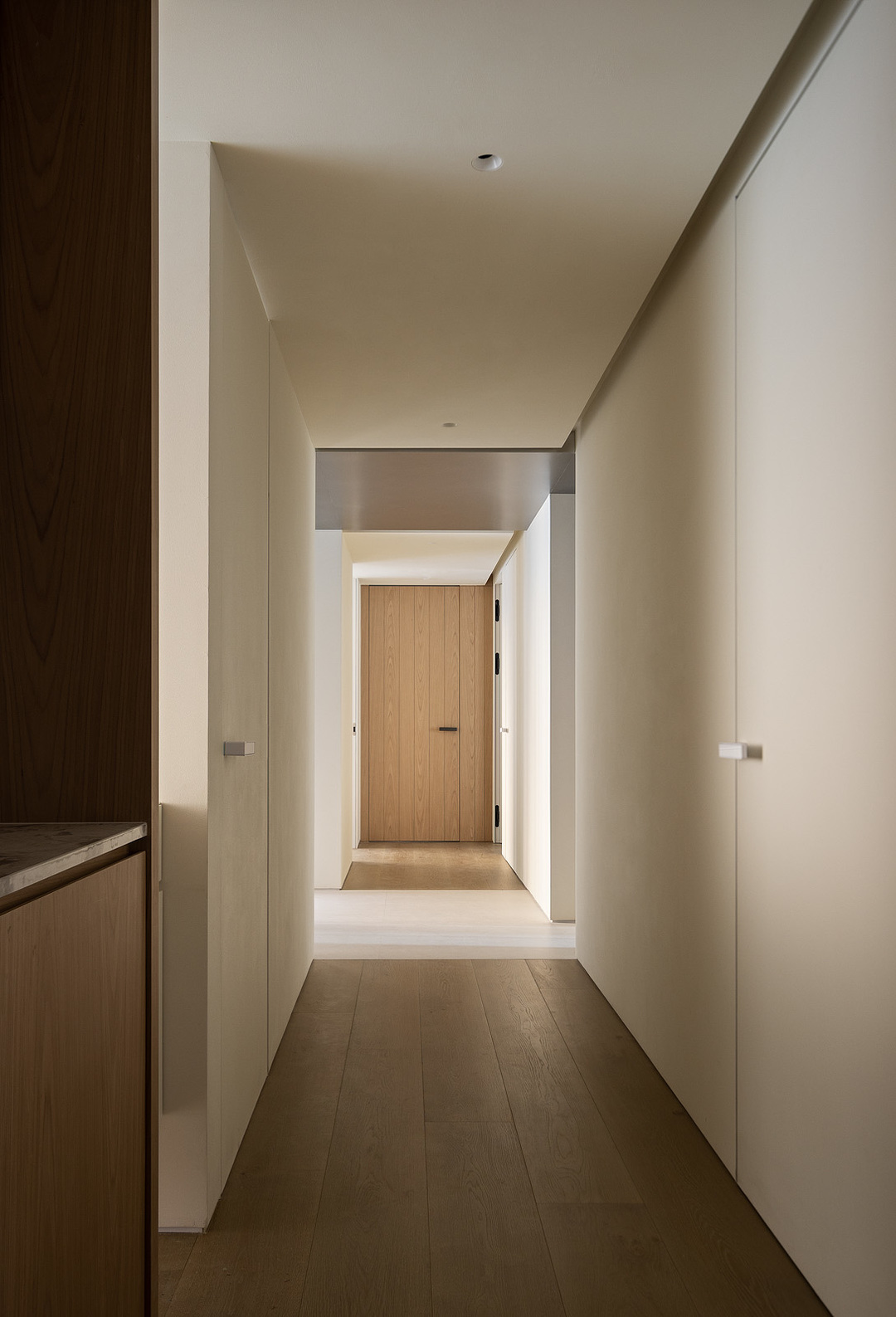 进入过道,以简洁的线条、纯粹的材质和巧妙的空间布局为特点,明暗交错的光影,彰显空间的细节魅力,灵动且赋有诗意。