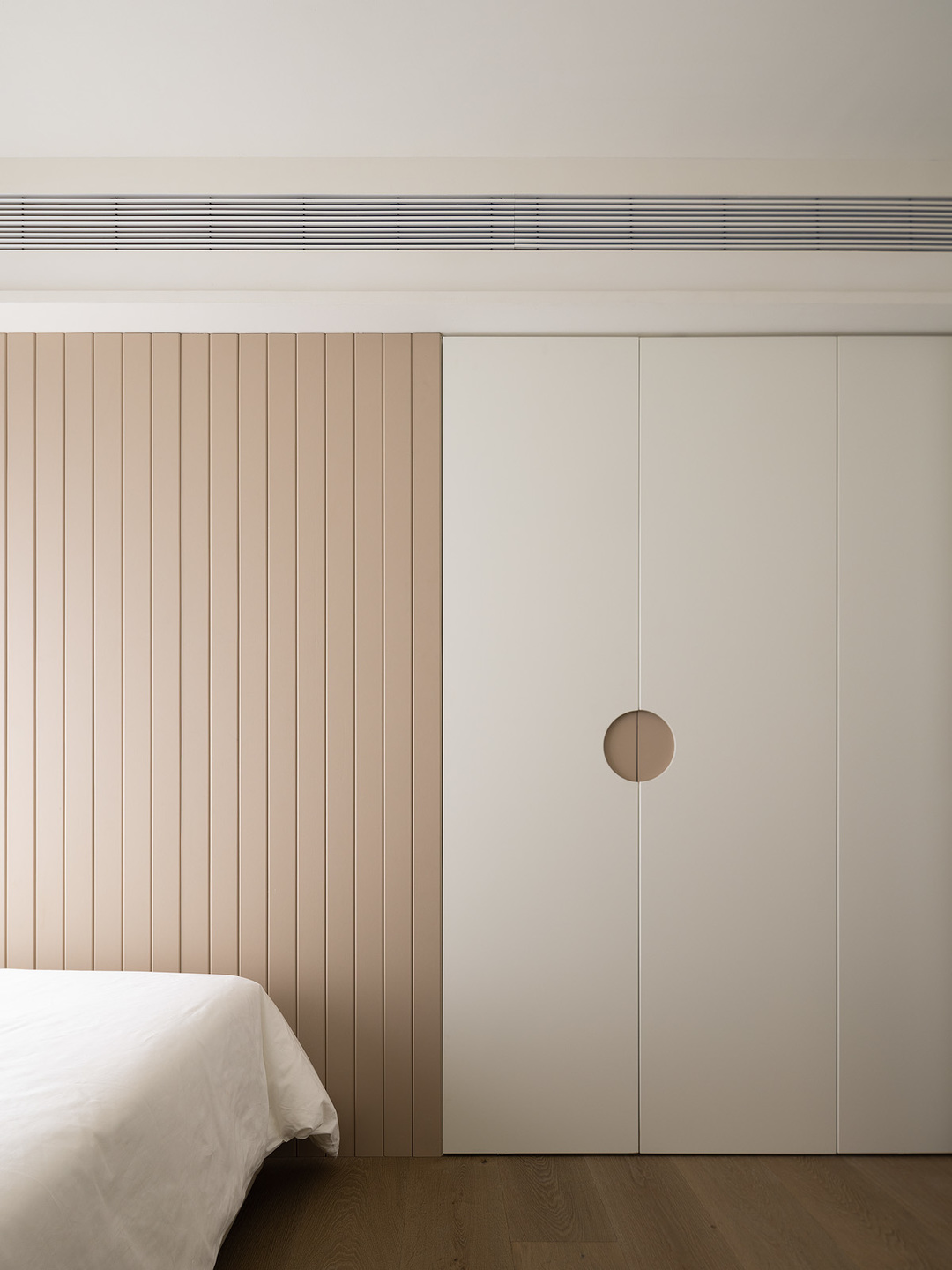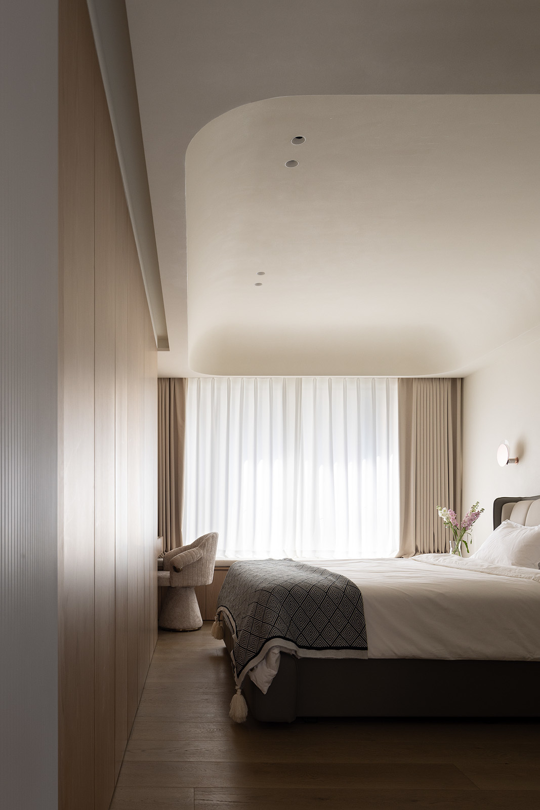 整个卧室通过不同材质的融合,及淡雅的配色,塑造出了一个简约优雅的休憩环境,让人在其中能够充分放松身心,享受沉浸式的睡眠时光。