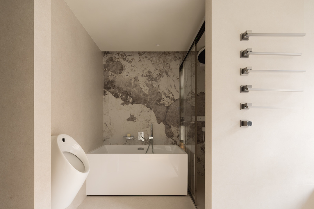 淋浴间与浴缸采用玻璃门相隔,功能的完备与合理布局则确保了使用者的舒适与便利。艺术的细节表现无所不在,大理石墙面,为空间带来不同的视觉观感。