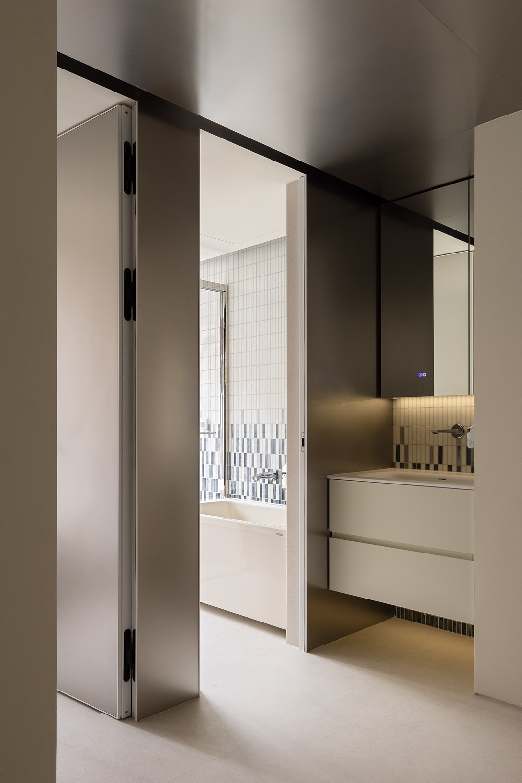 通往休息区的过道中设置了三分离卫浴,满足居住者的的基本生活需求,又巧妙地利用了空间,金属银磨砂面的装饰,赋予空间一种神秘又深邃的效果,穿越在过道有种来到未来的科幻世界。