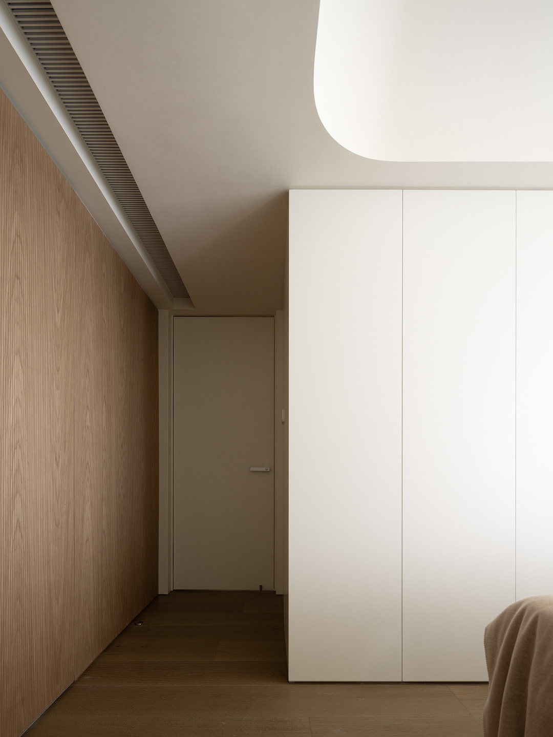 整面收纳柜能够充分利用墙面空间,为日常生活中的各种物品提供充足的收纳位置,同时,柜门和过道移门合二为一的设计巧思,进一步节省了空间,更让通往过道的休息区,拥有绝对的私密性。