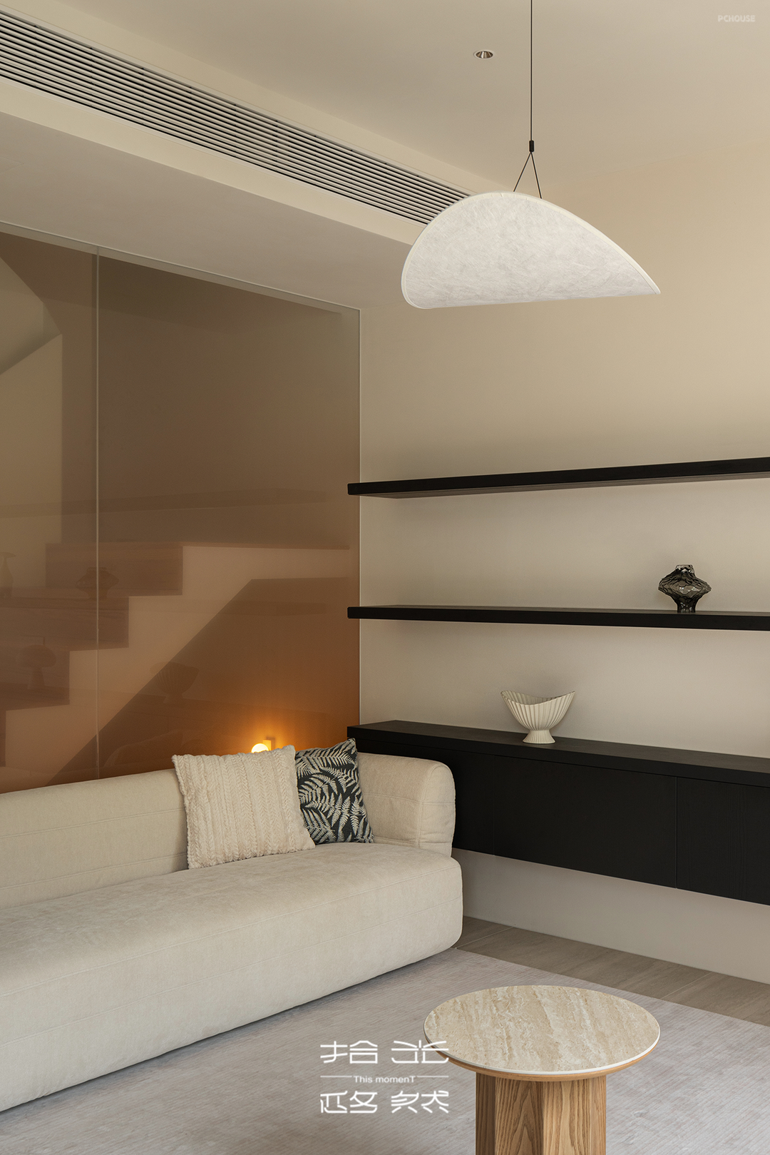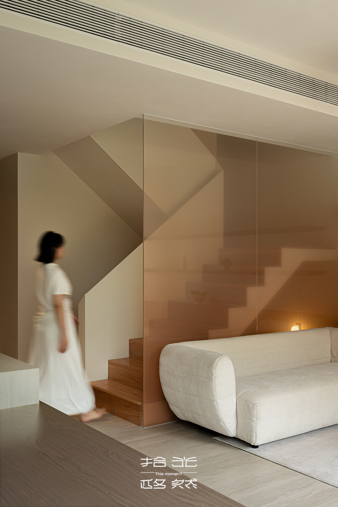 半透玻璃墙像层会呼吸的滤镜,楼梯的影子、客厅的声响,全被揉成流动的片段。