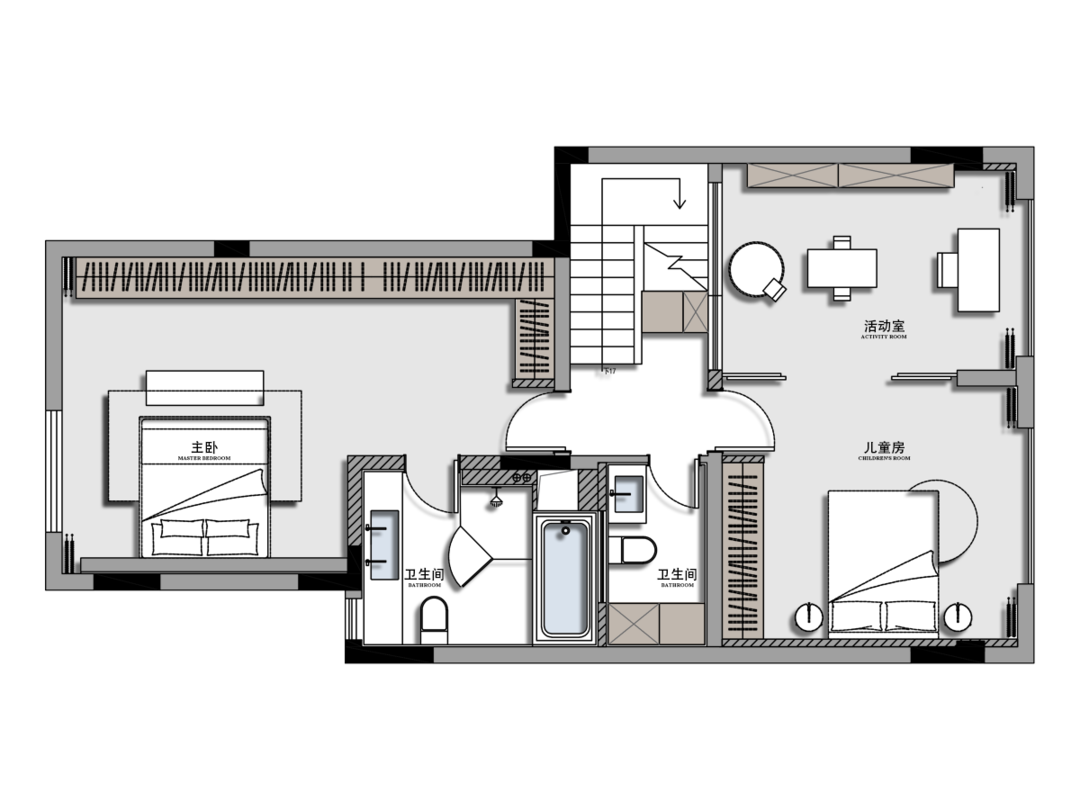 二楼:衣帽间采光差、次卫与楼梯间无采光。