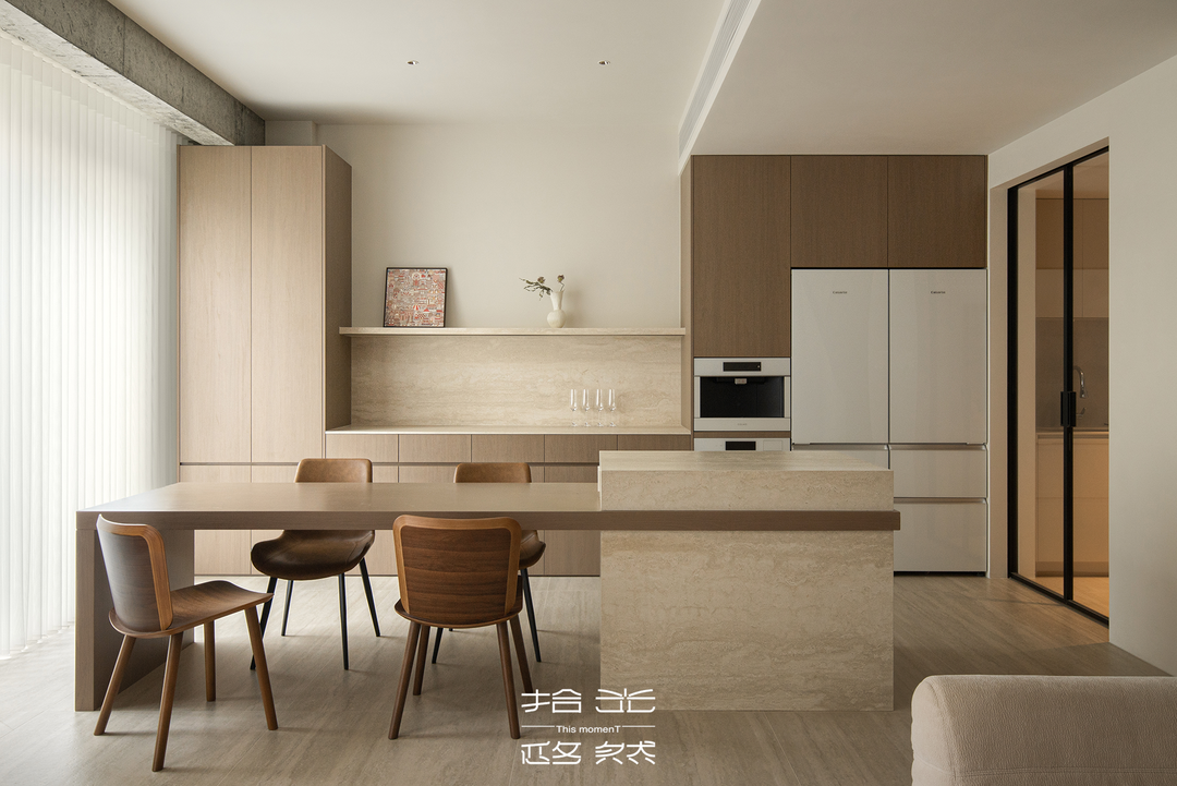 木质餐桌的纹理、石质岛台的细腻、柜体的柔和色调,像把阳光晒过的温暖,都铺进了用餐场景。